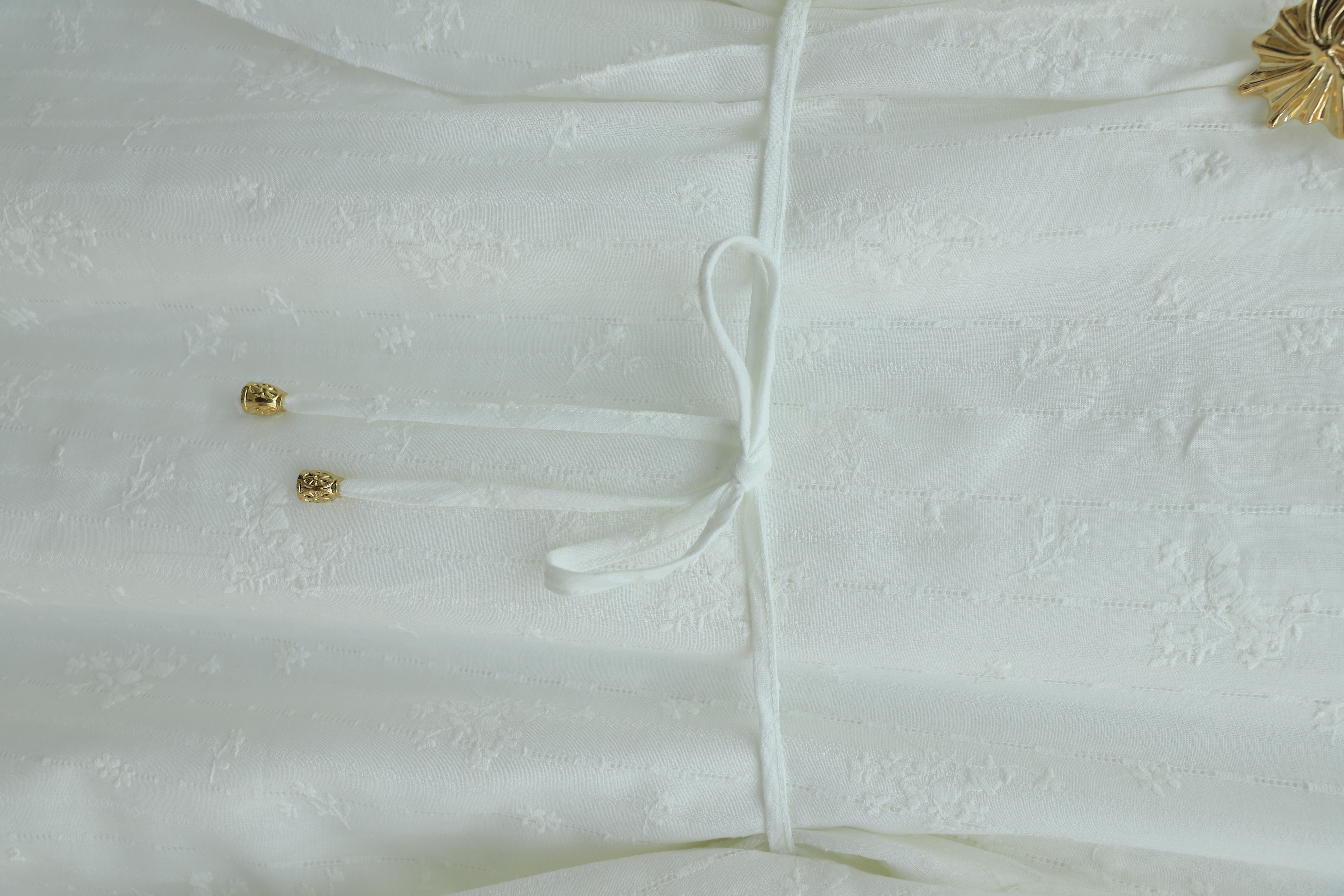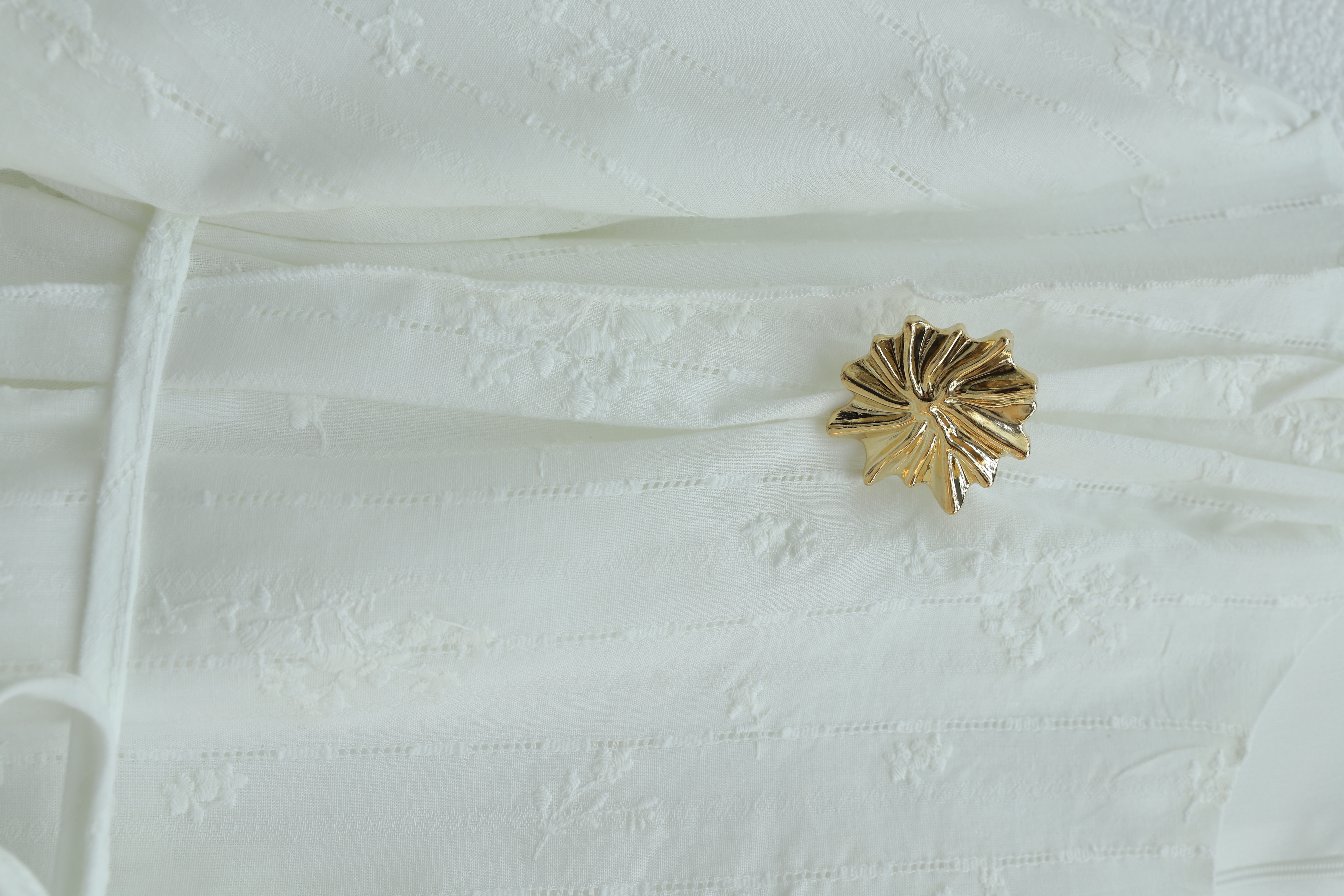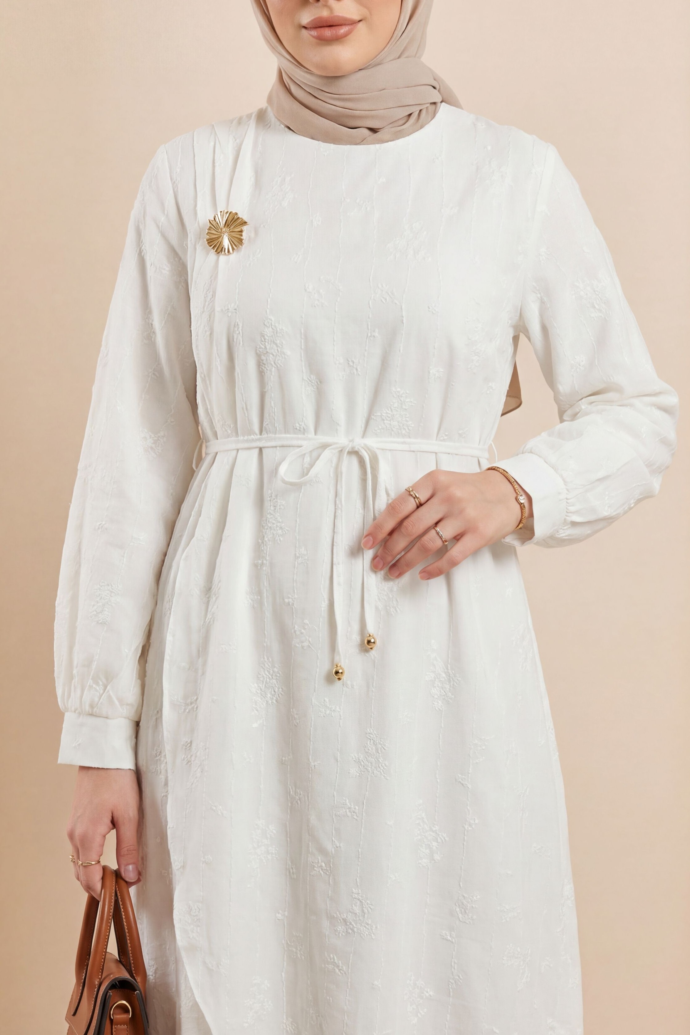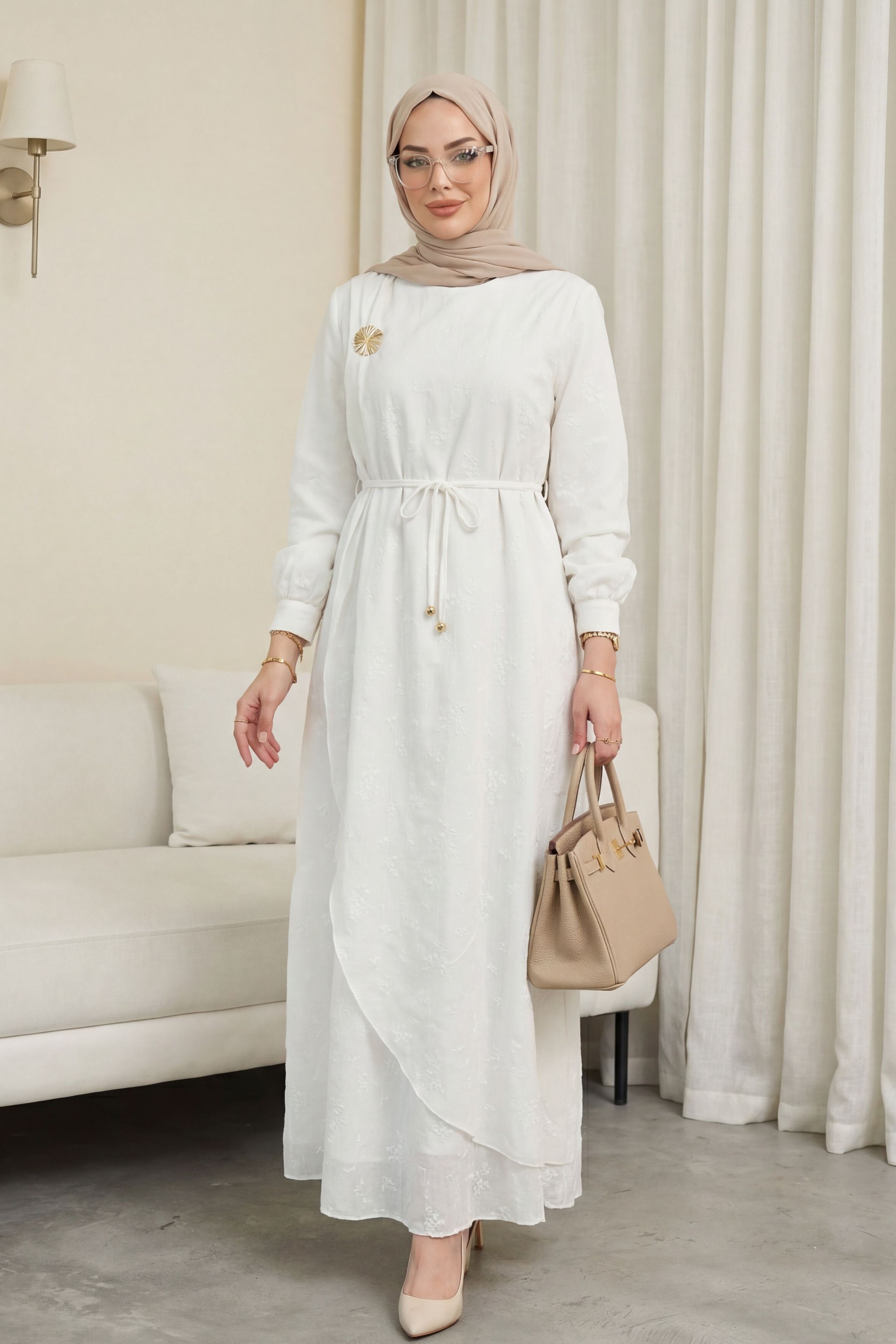 Podyumplus Önü Çift Kat Belden Bağlamalı Broşlu Astarlı Keten Elbise -Beyaz