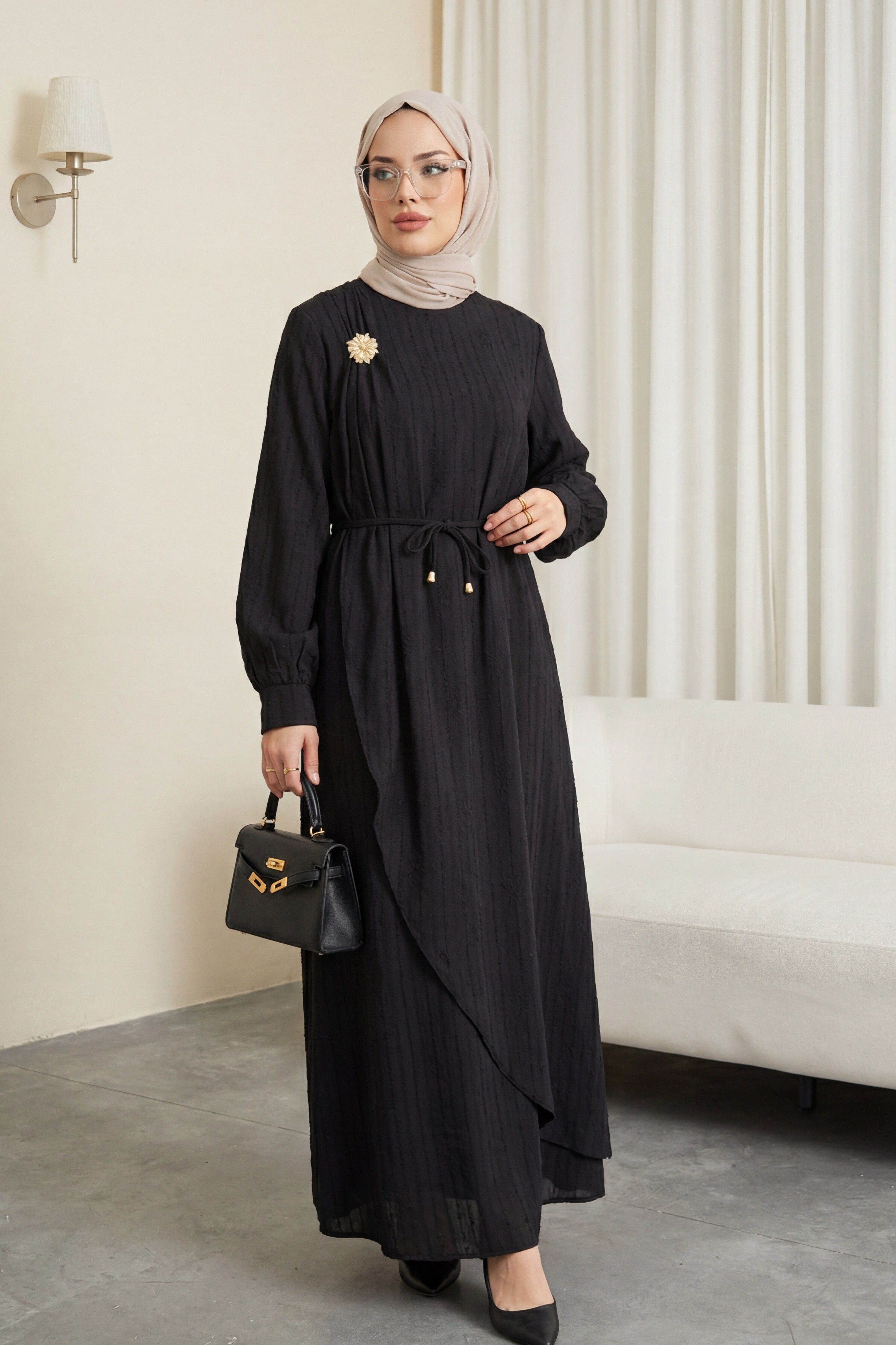 Kombindeki şal, çanta, ayakkabı ve takılar aksesuar olarak kullanılmıştır.