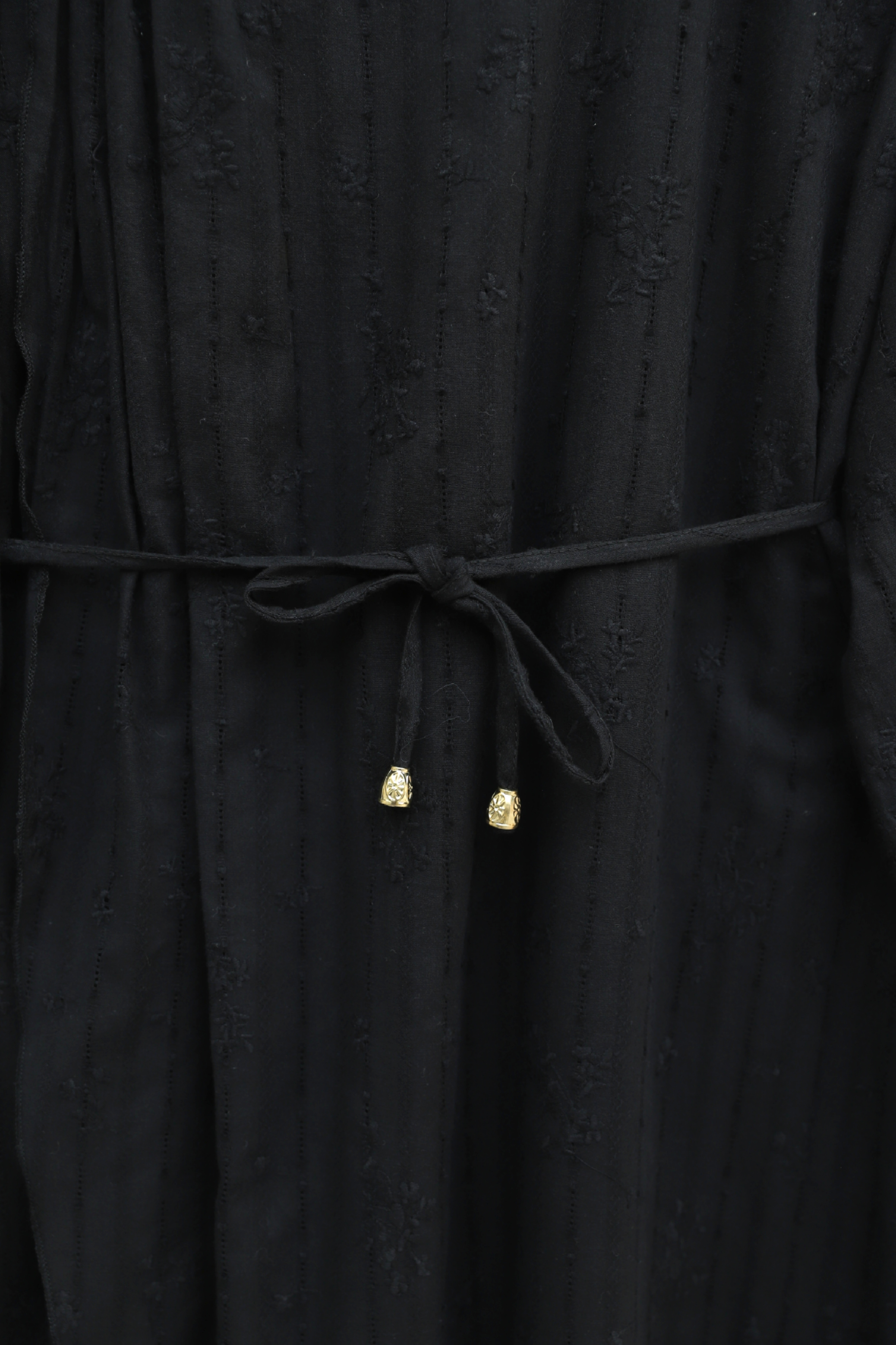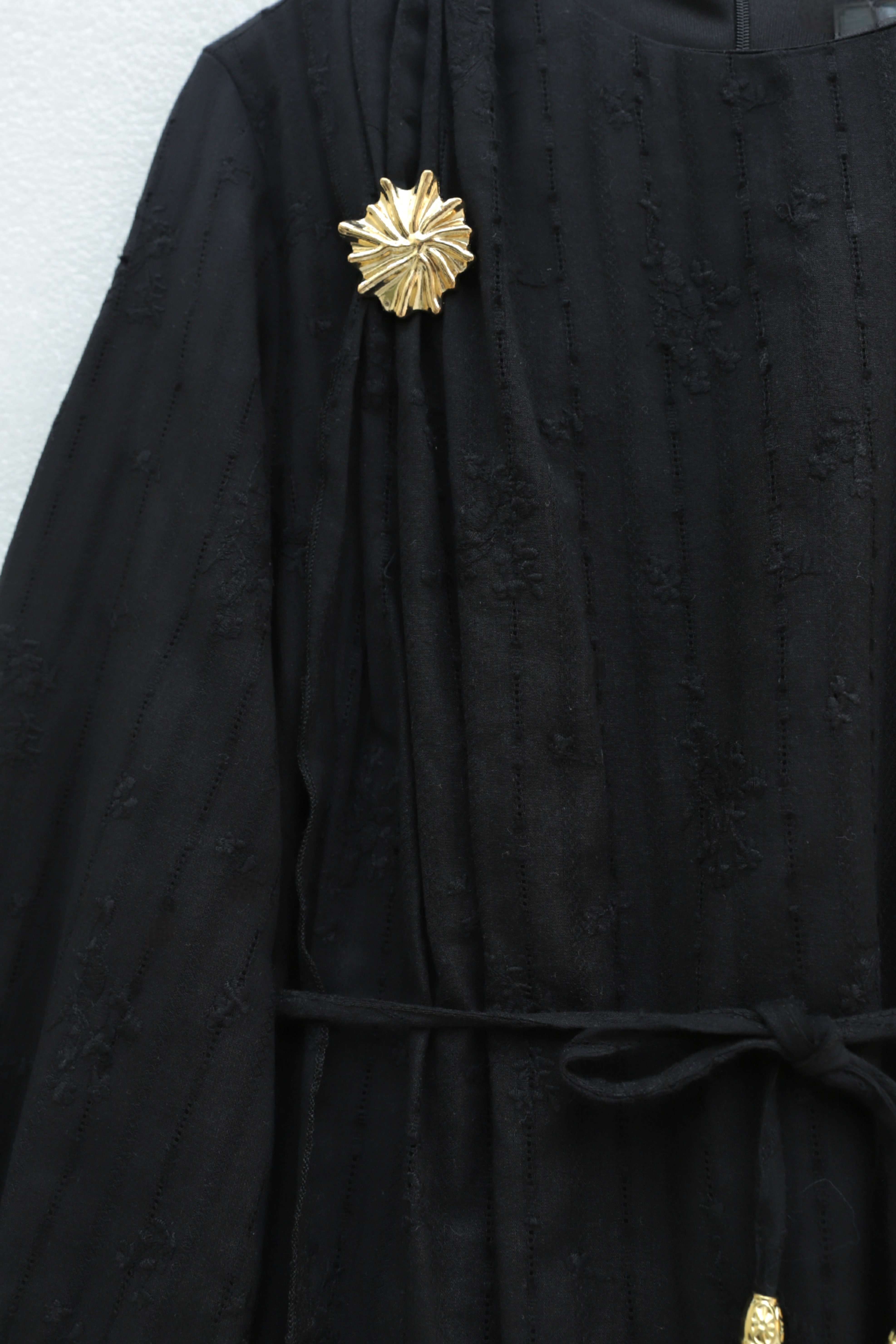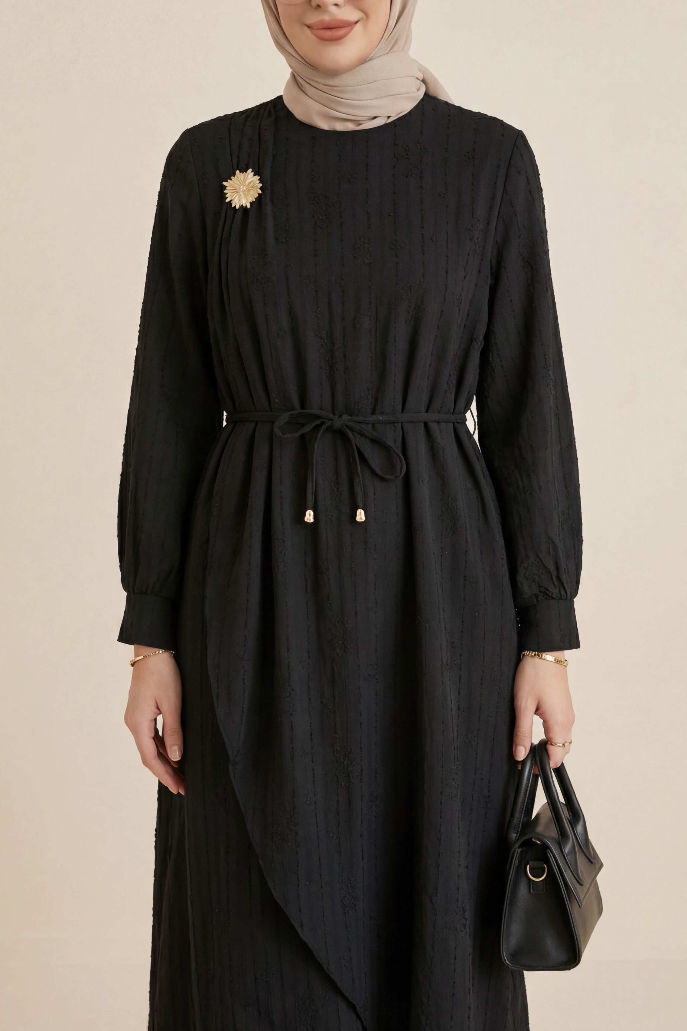 Podyumplus Önü Çift Kat Belden Bağlamalı Broşlu Astarlı Keten Elbise -Siyah