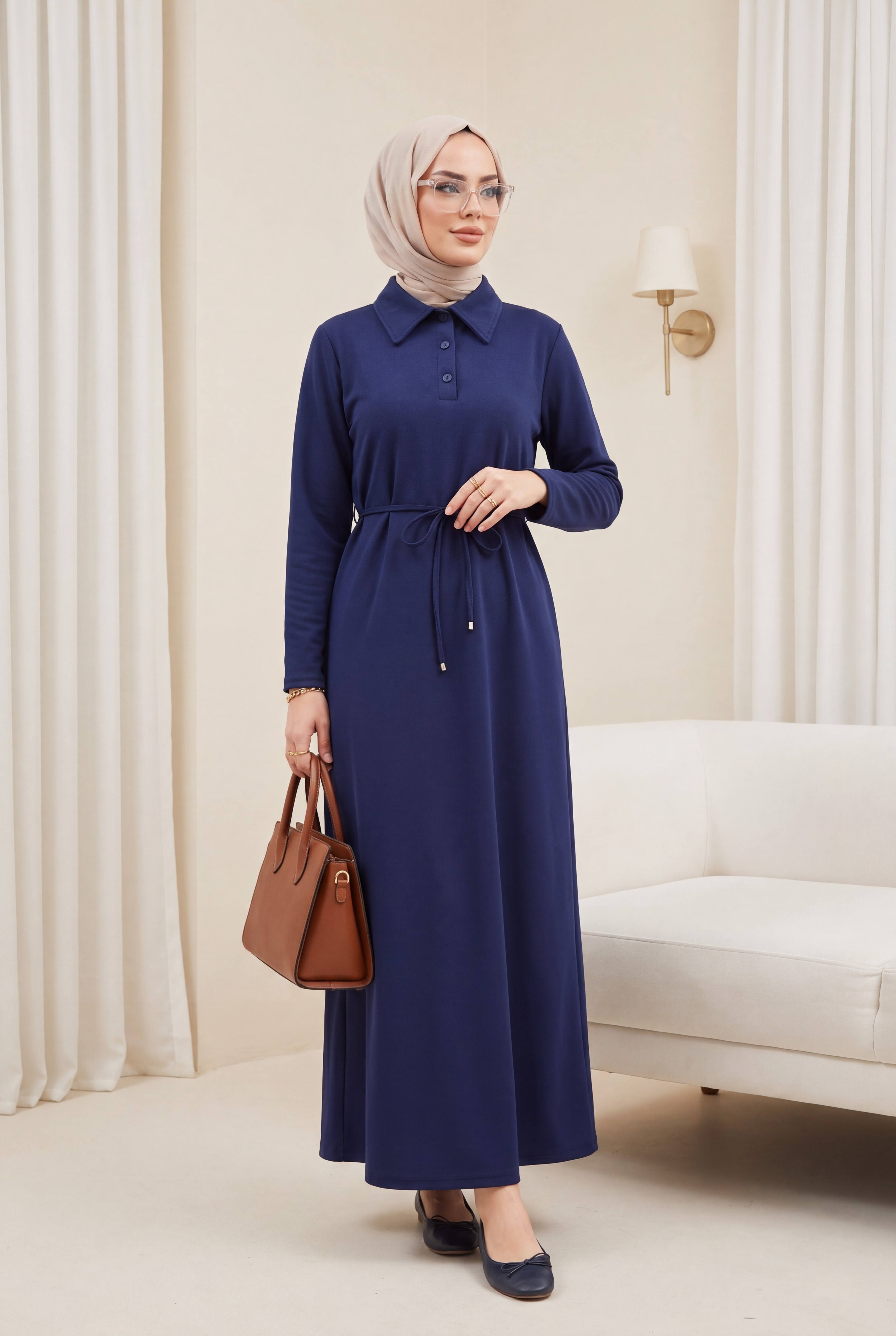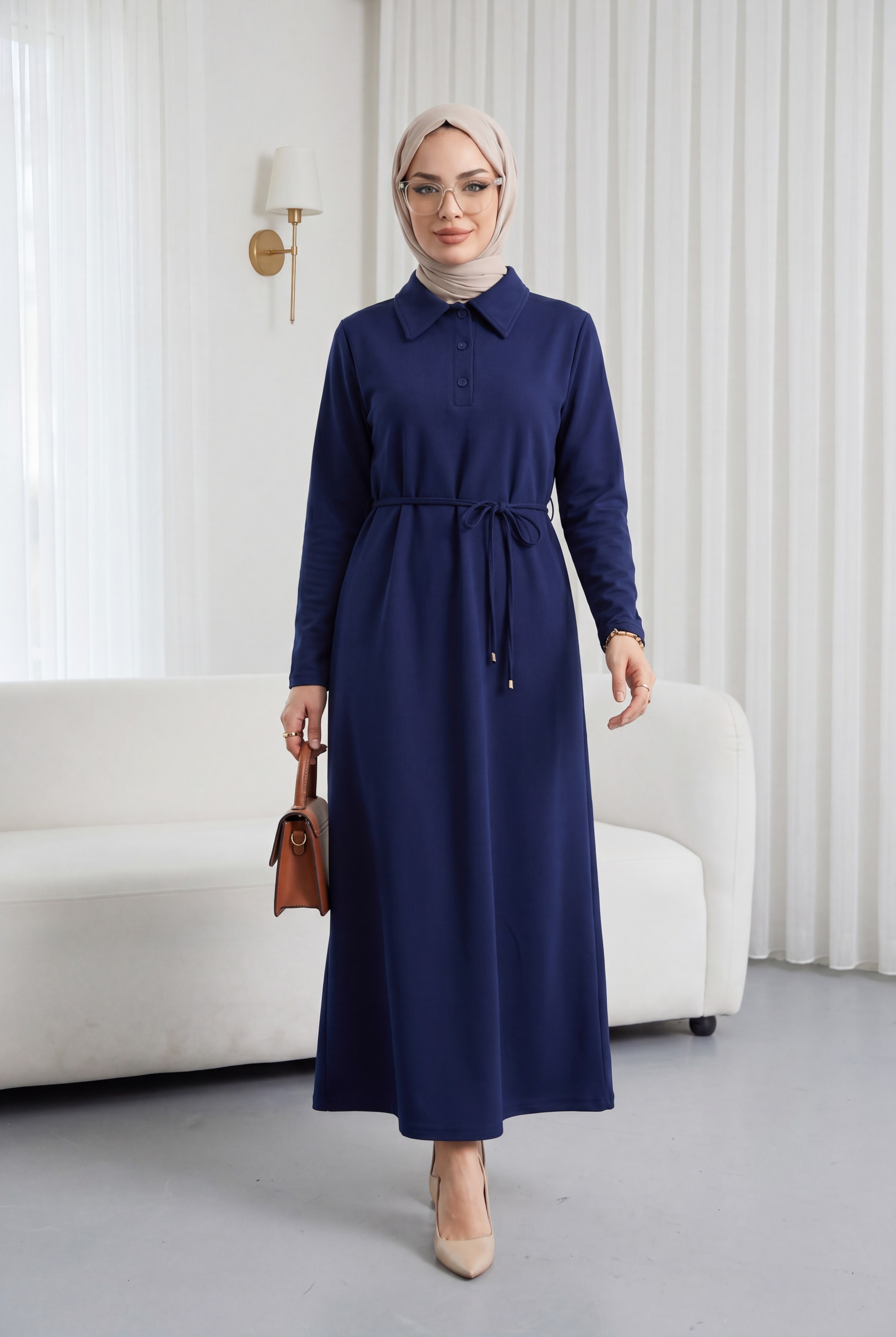 Yakalı  Düğmeli Beli Bağlamalı Penye Elbise