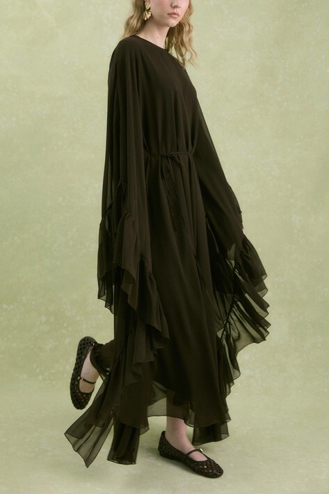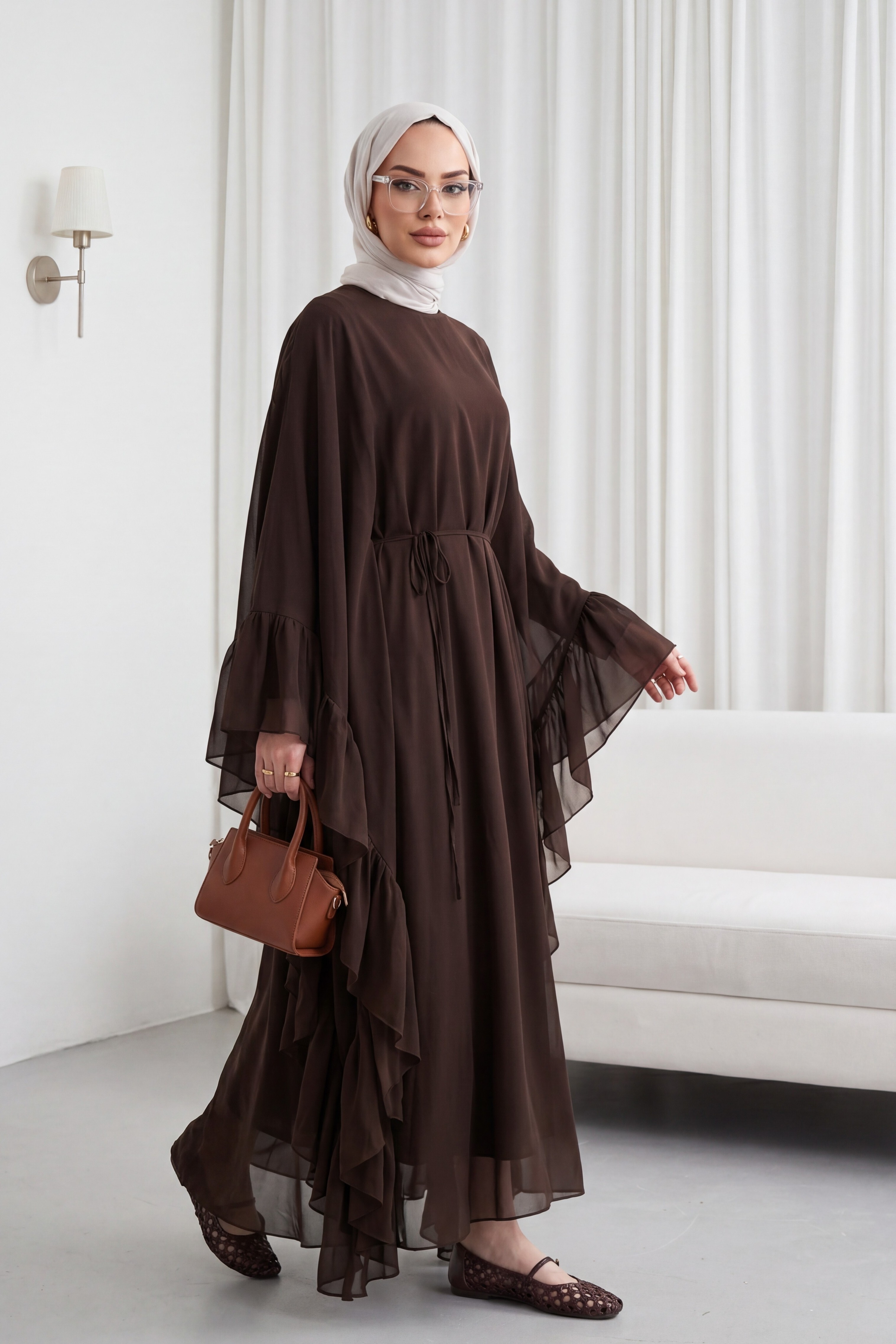 Yanı Fırfırlı Asimetrik Kesim Bağcıklı İçlikli Şifon Elbise Abaya Takım -Kahverengi