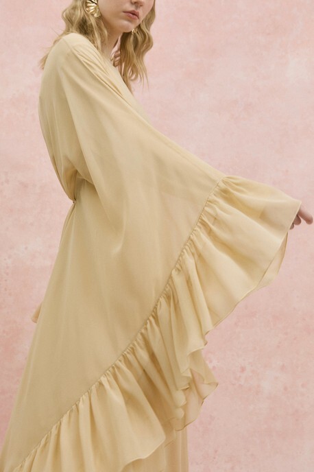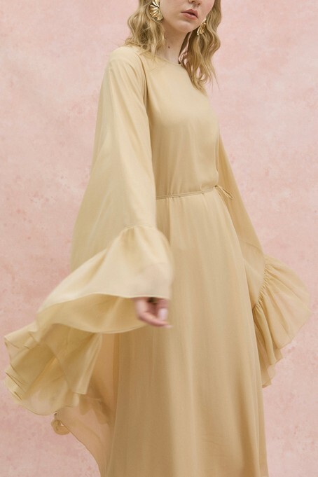 Yanı Fırfırlı Asimetrik Kesim Bağcıklı İçlikli Şifon Elbise Abaya Takım -Bej