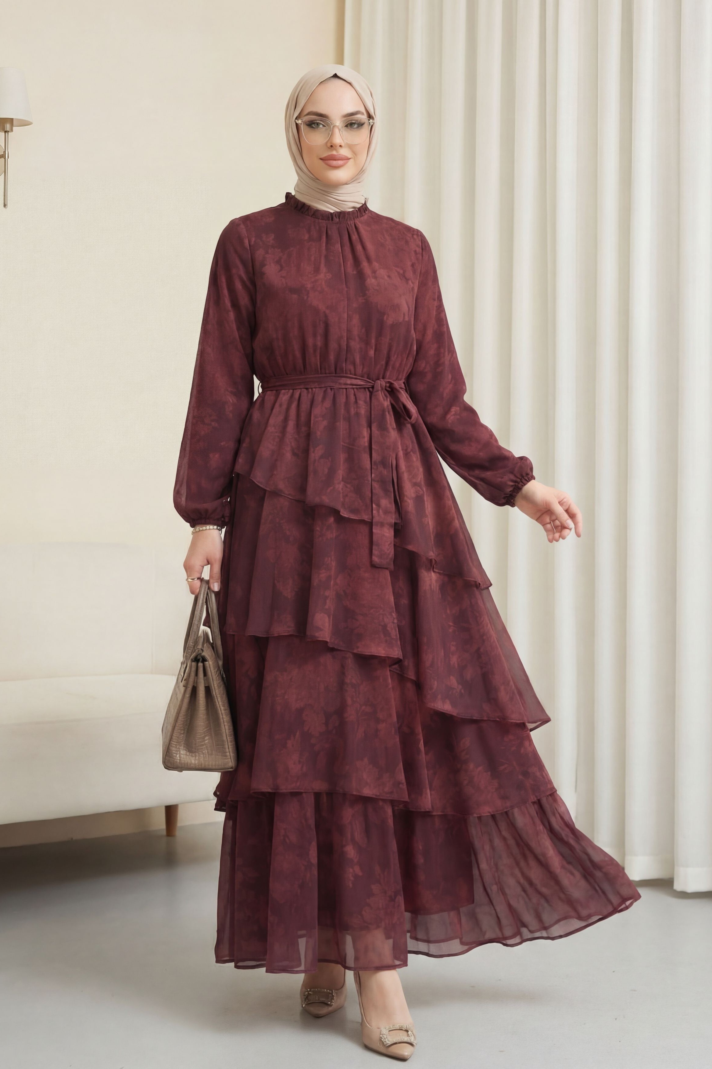 “desenli şifon elbise”, “katlı etekli elbise”, “bağcıklı kadın elbise”, “romantik elbise modeli” gibi adlandırılabilir.
