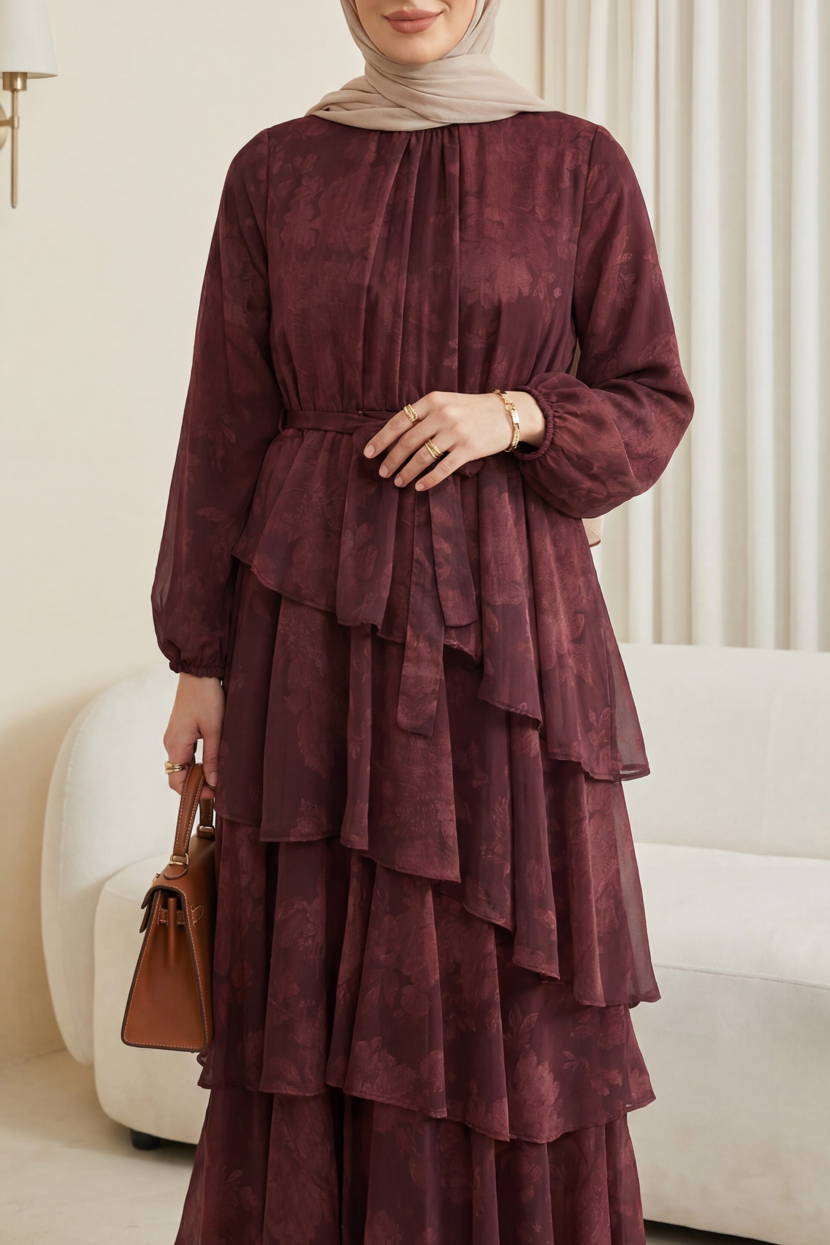 Kombindeki şal, çanta, ayakkabı ve takılar aksesuar olarak kullanılmıştır.
