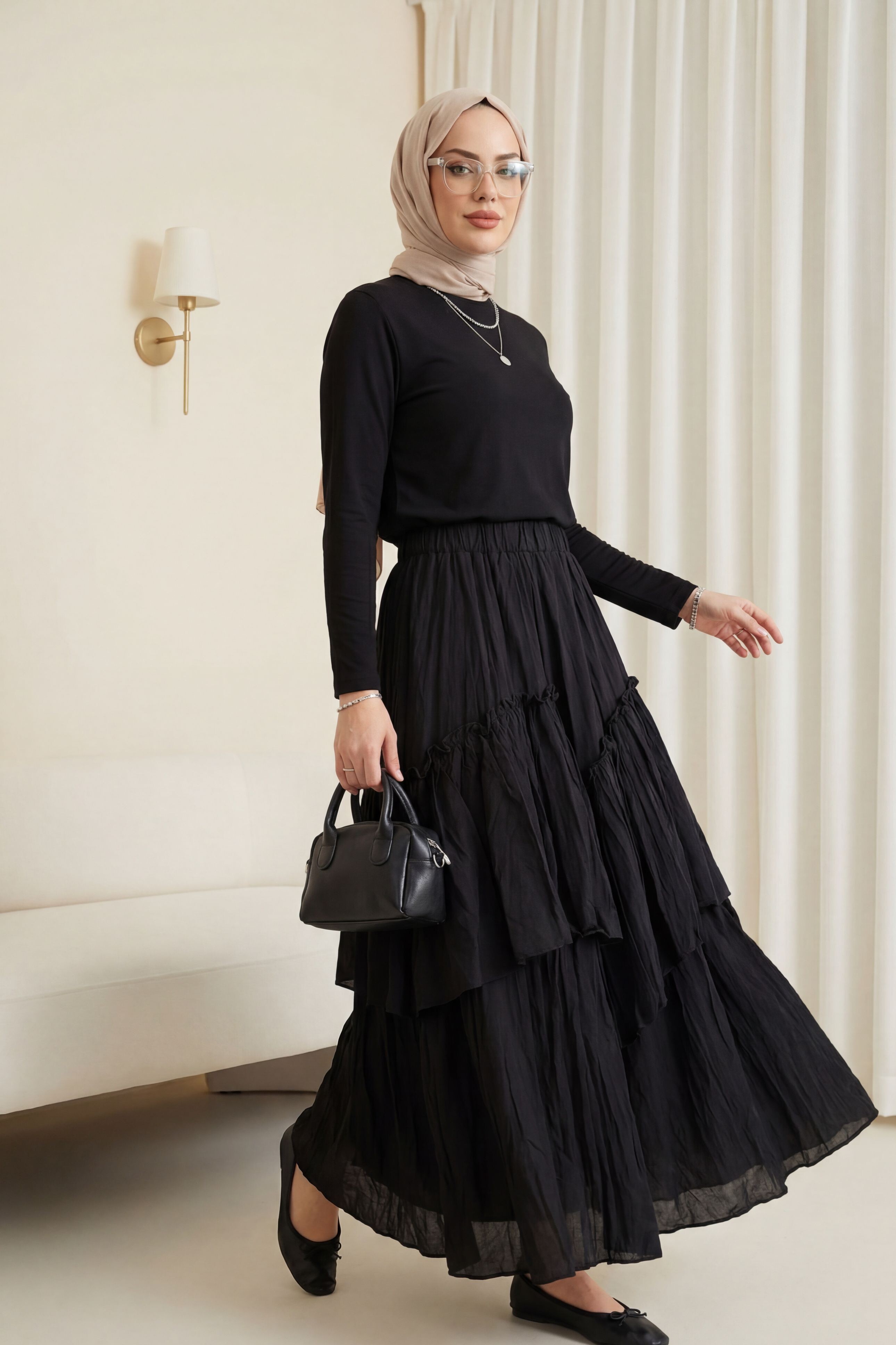 Beli Lastikli Keten Vual Katlı Etek, zarif ve rahat bir stil sunar. Katlı tasarımı hareketli bir siluet oluştururken, vual dokusu hafif ve akışkan bir görünüm sağlar. Beli lastikli yapısı gün boyu konfor sunar. Keten karışımlı kumaşı nefes alabilendir.