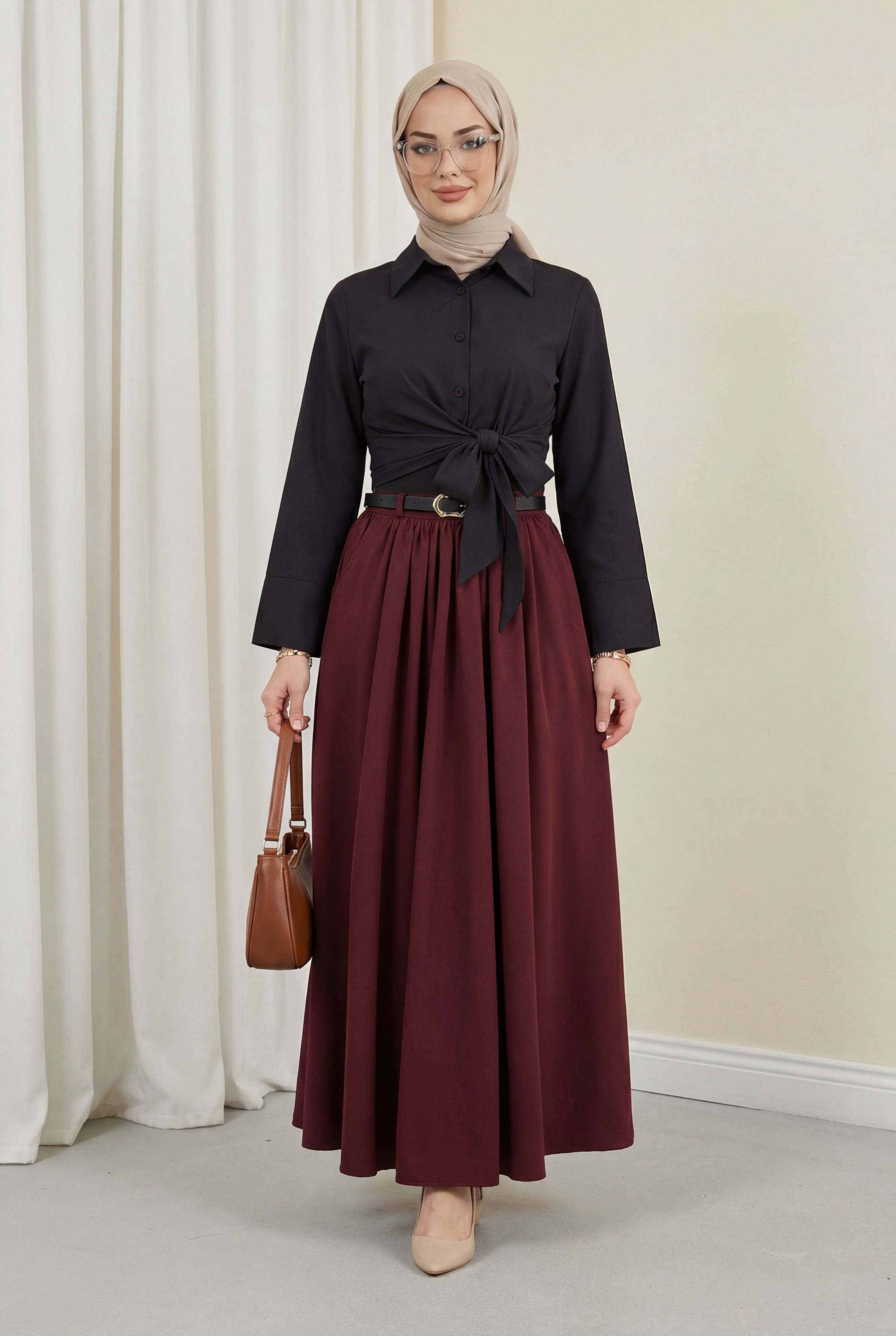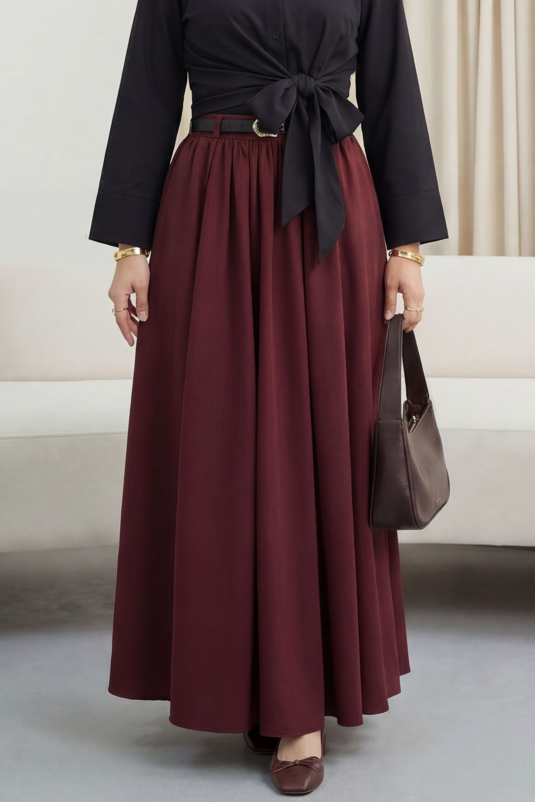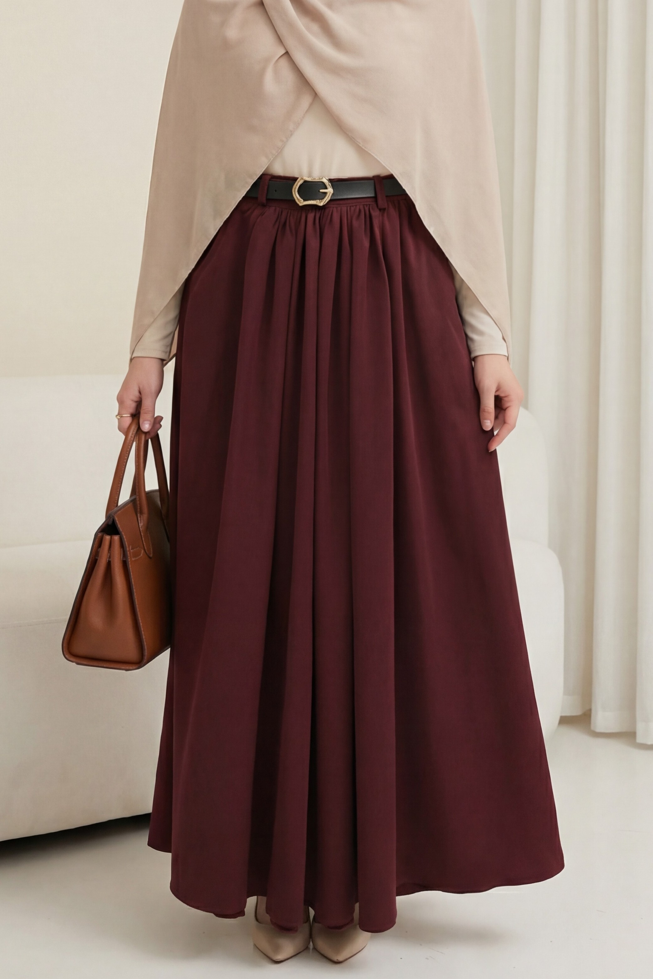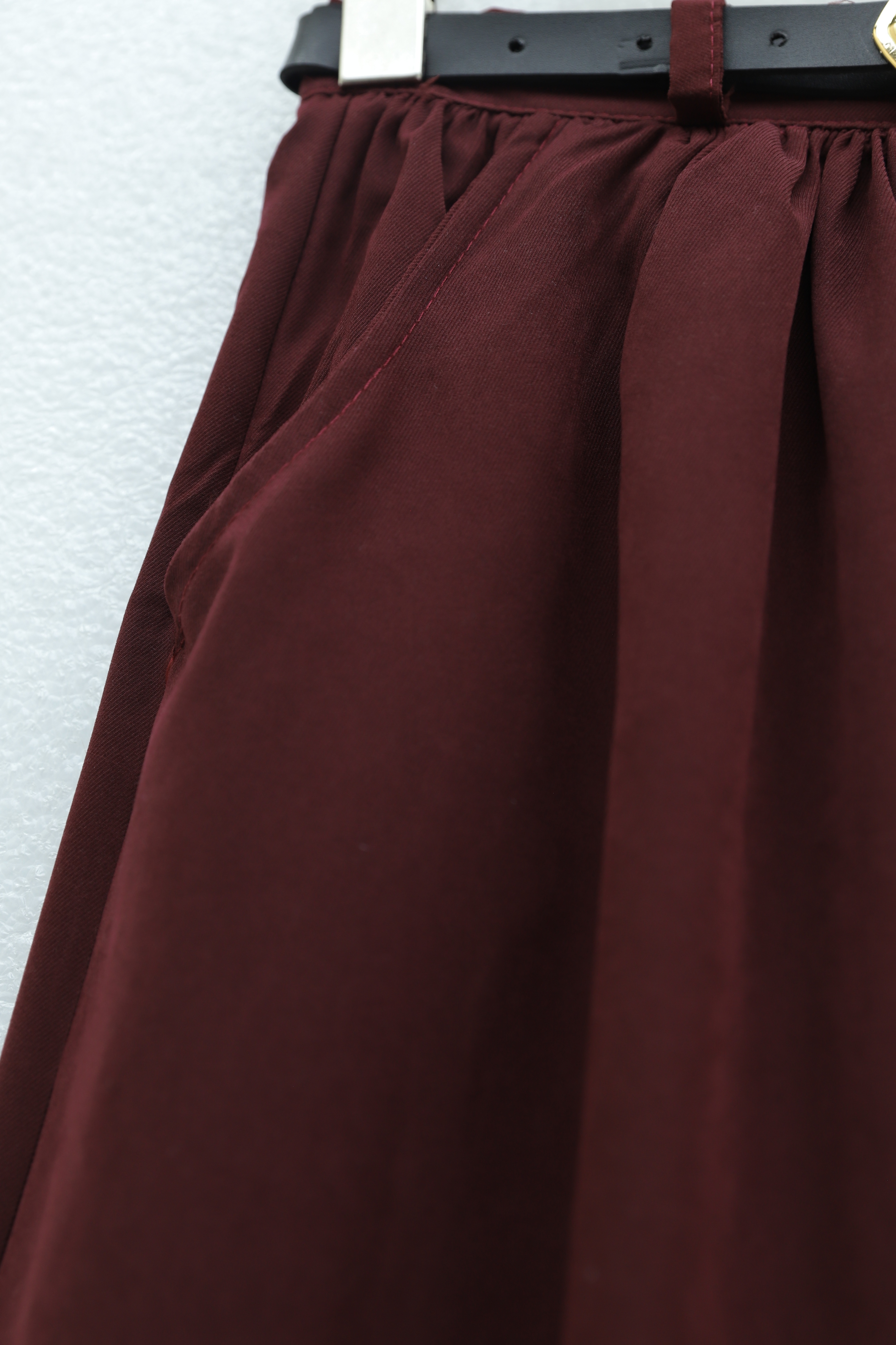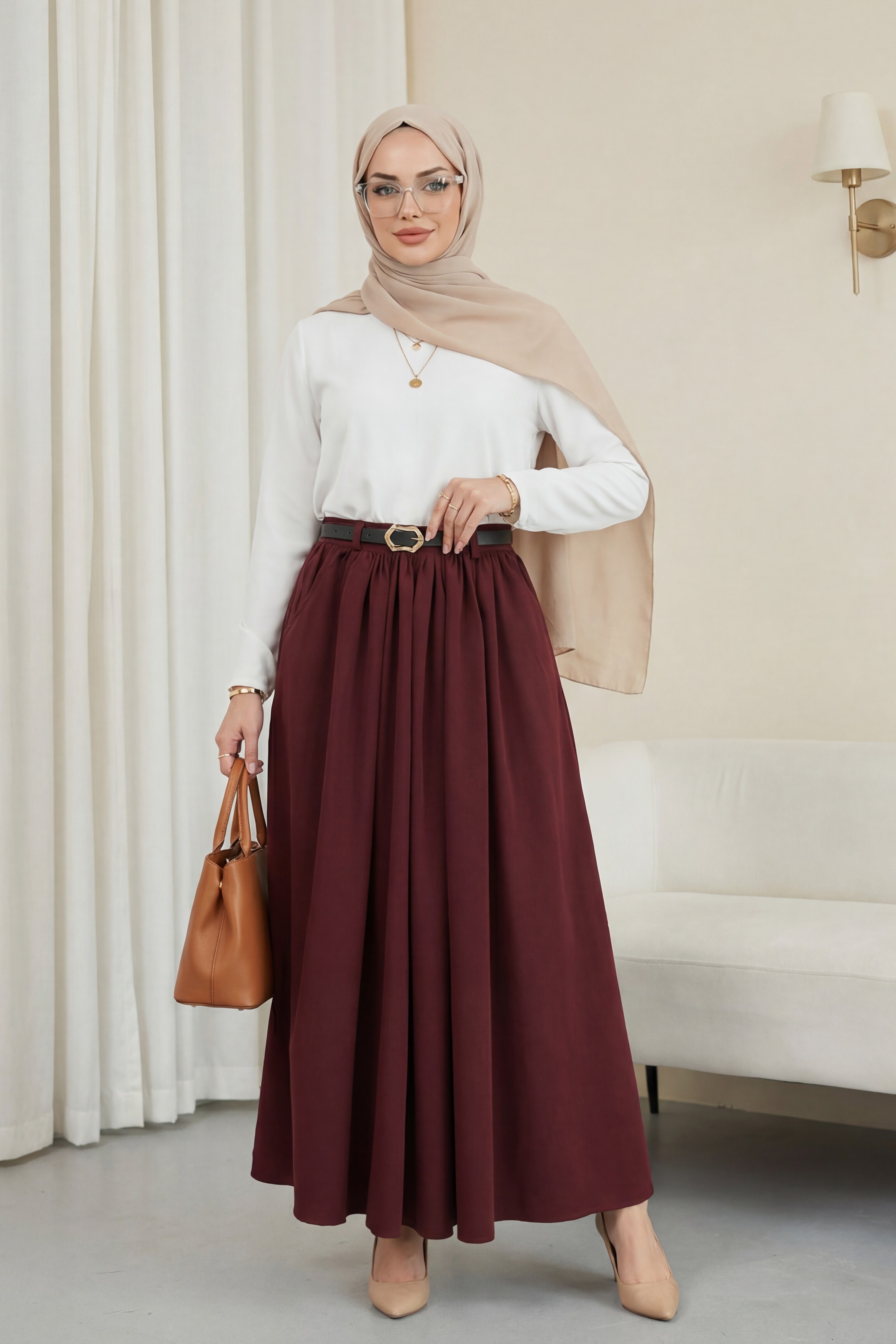 Podyumplus Tokalı Kemerli Piliseli Yan Cepli Fermuarlı Tivil Etek -Bordo