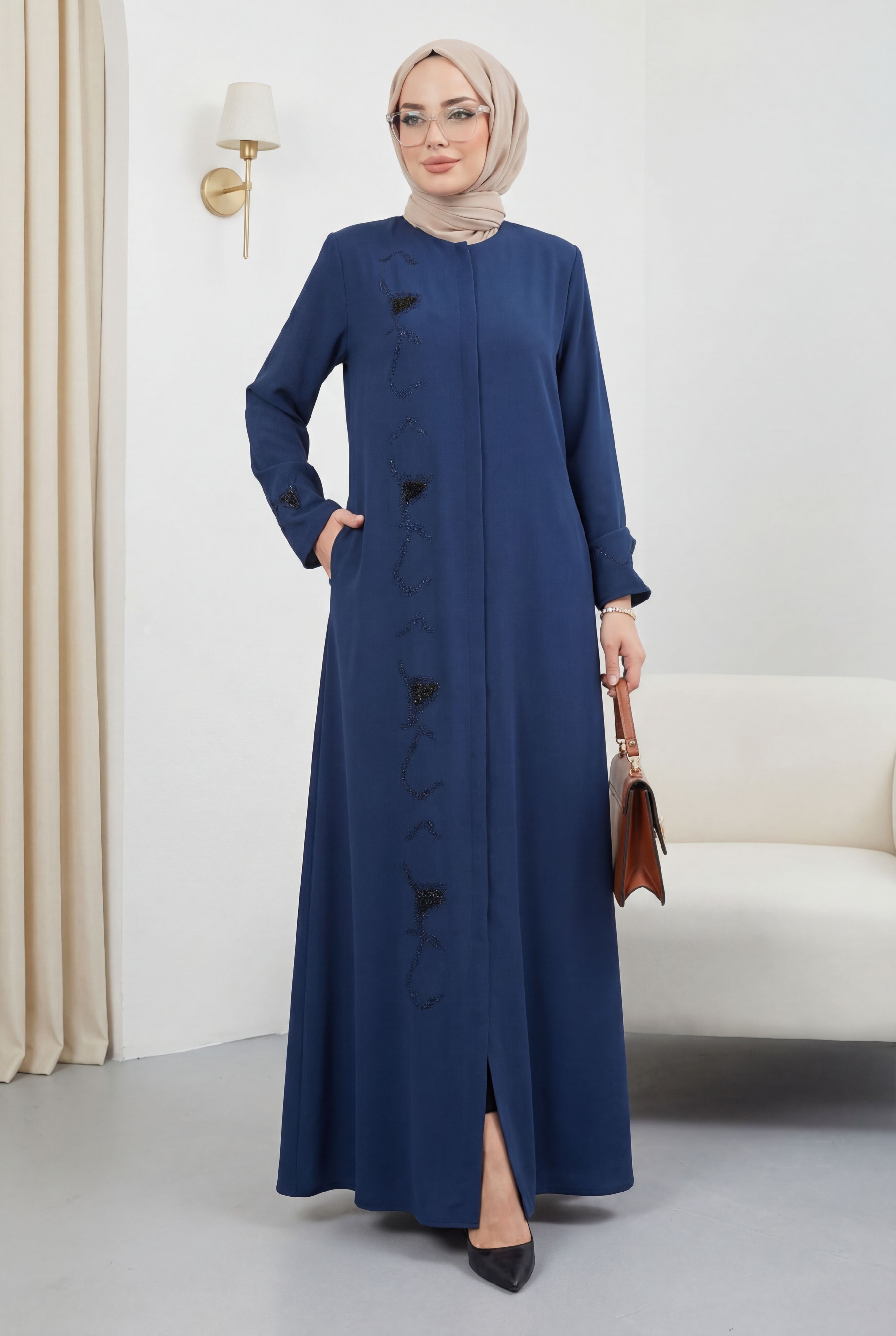 Ürün Özelliği : Bisiklet yaka, gizli patlı, boydan fermuarlı, önü ve kolları deri işleme detaylı Ferace modelidir. Omuzları vatkalı, yandan cepli, astarsızdır. Ürün renginde konsept çekimlerinden dolayı ton farklılığı olabilir.