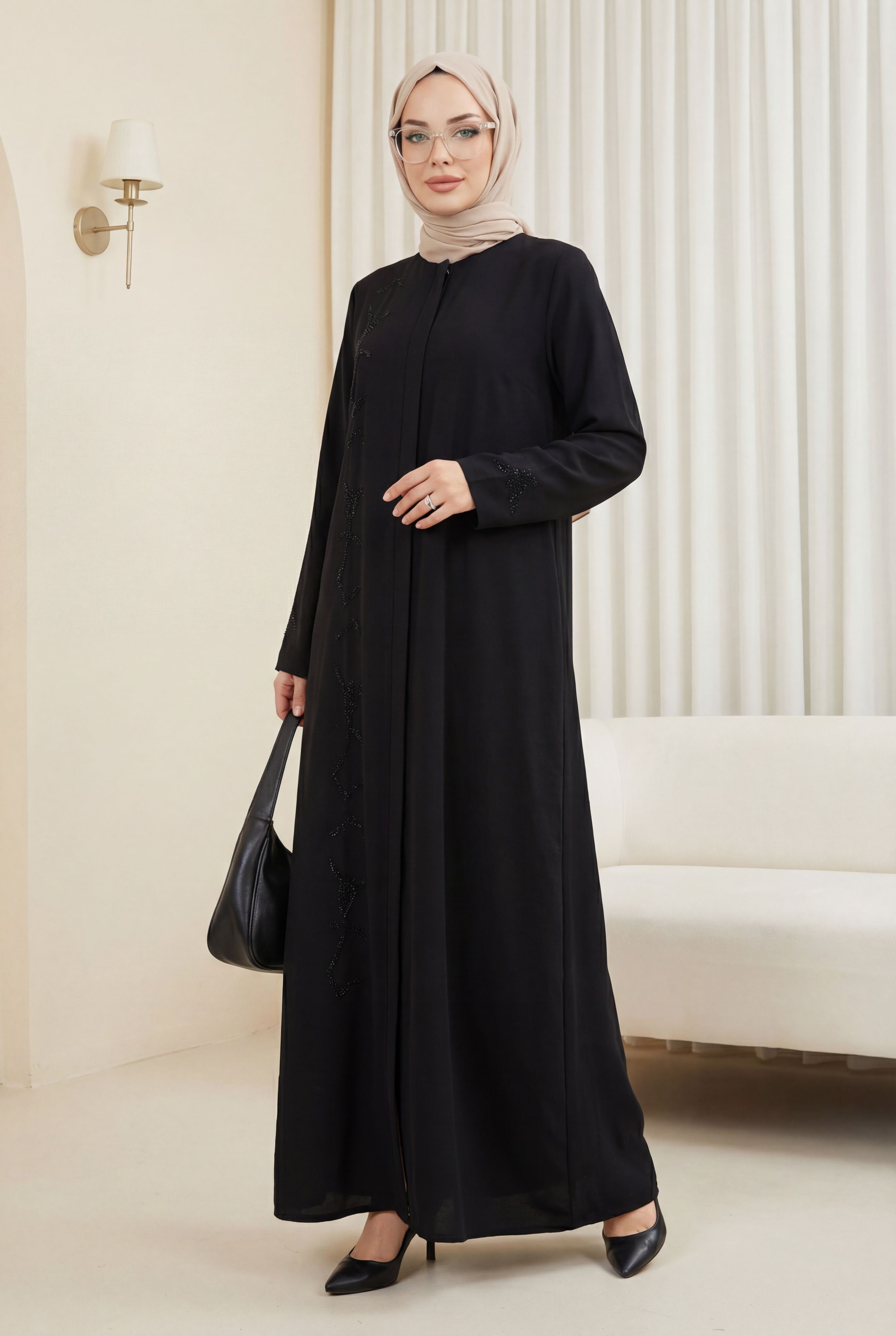 Gizli Patlı Taşlı Ferace Siyah HM2851