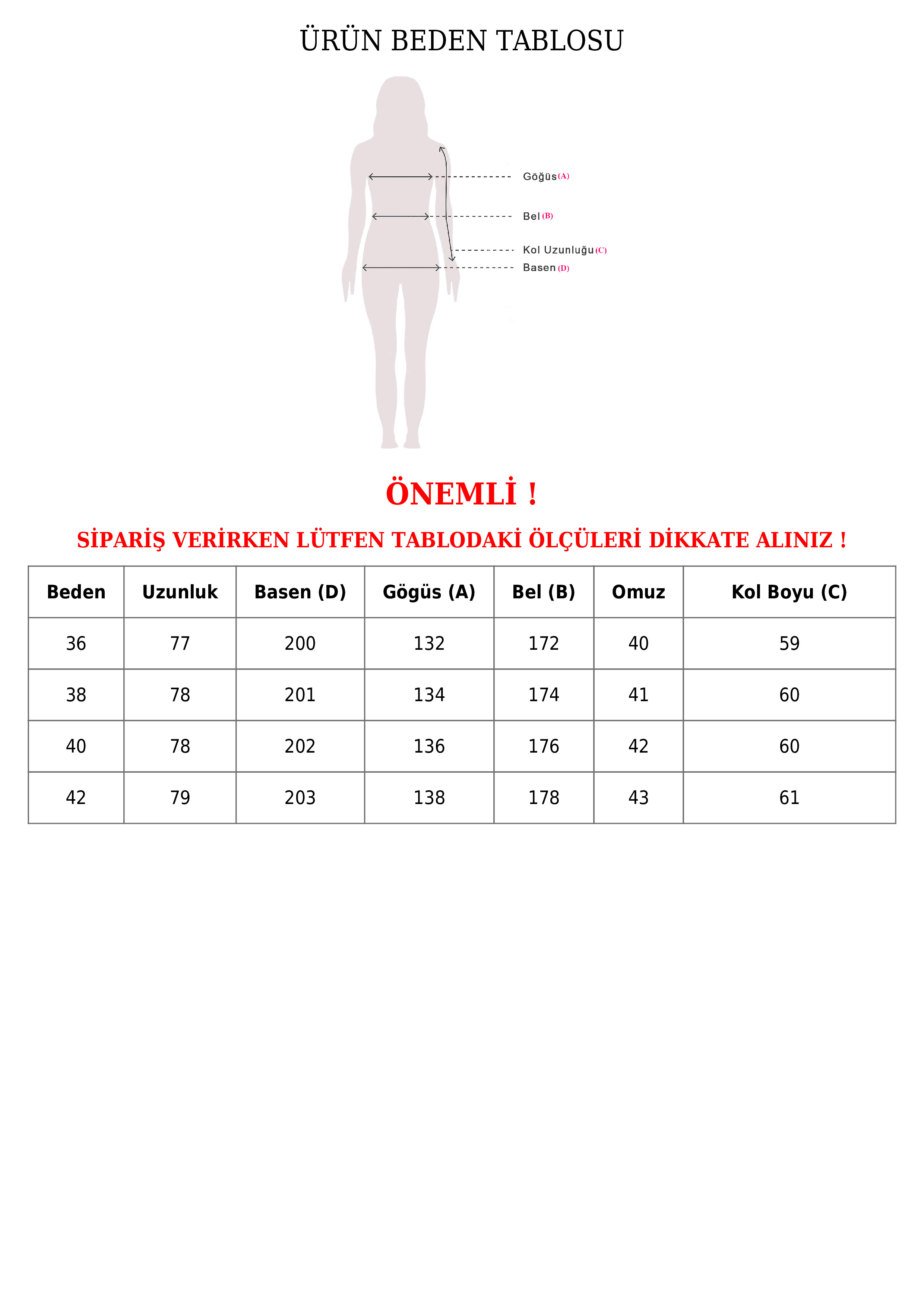 | Beden | Uzunluk | Basen | Göğüs | Bel | Omuz | Kol Boyu |