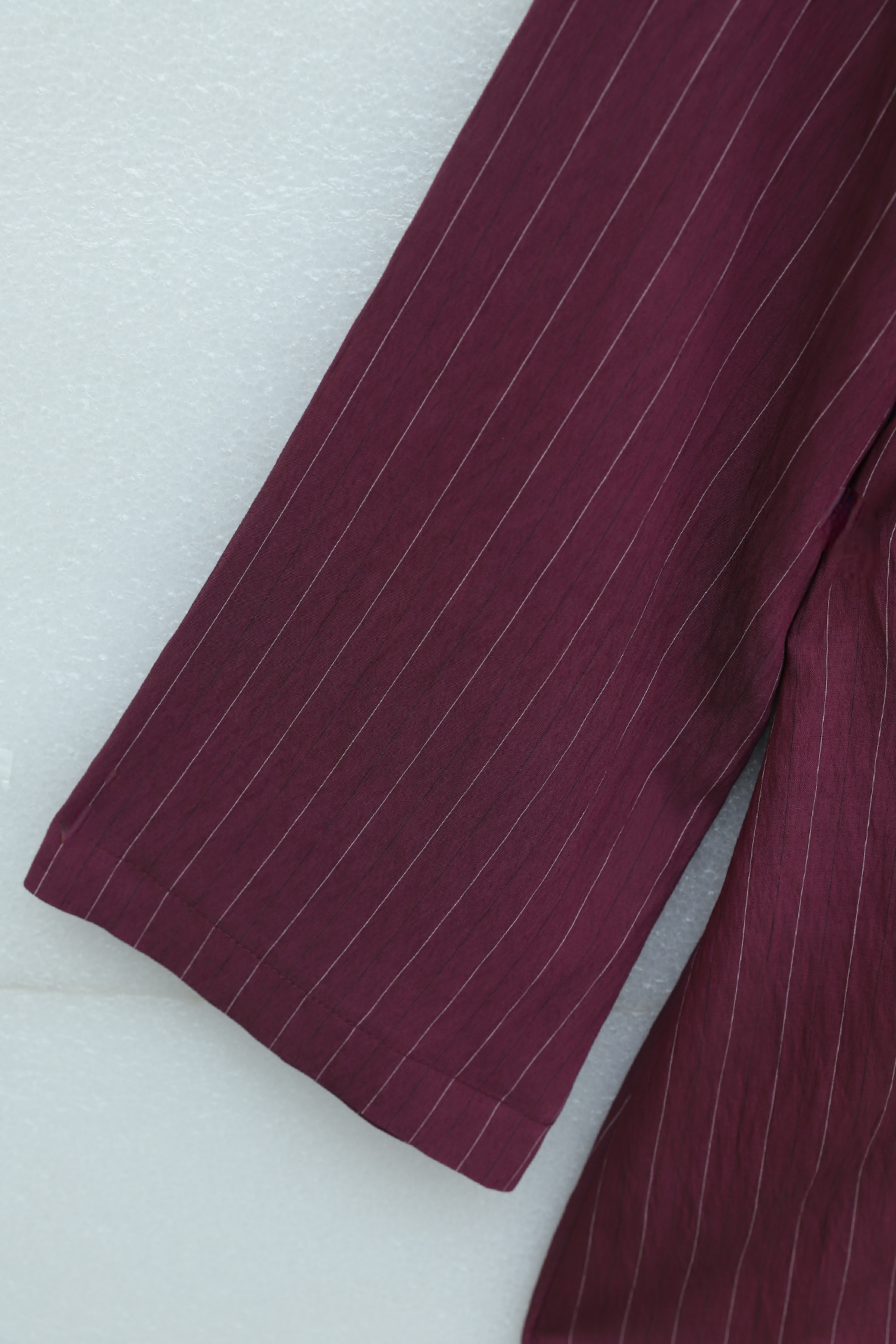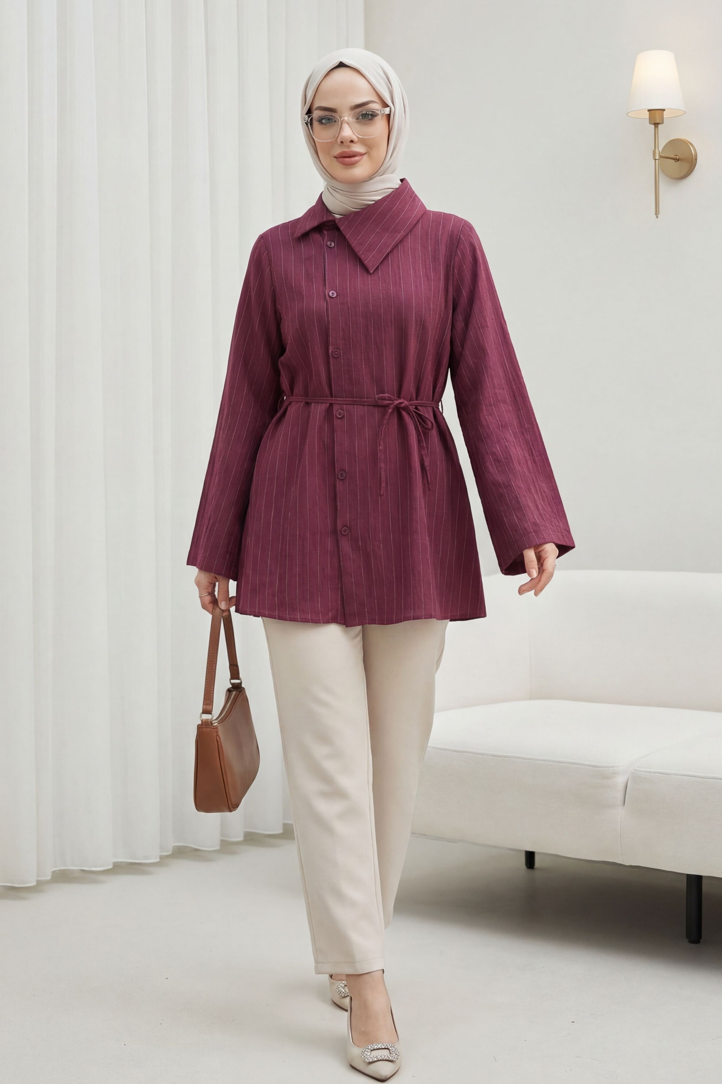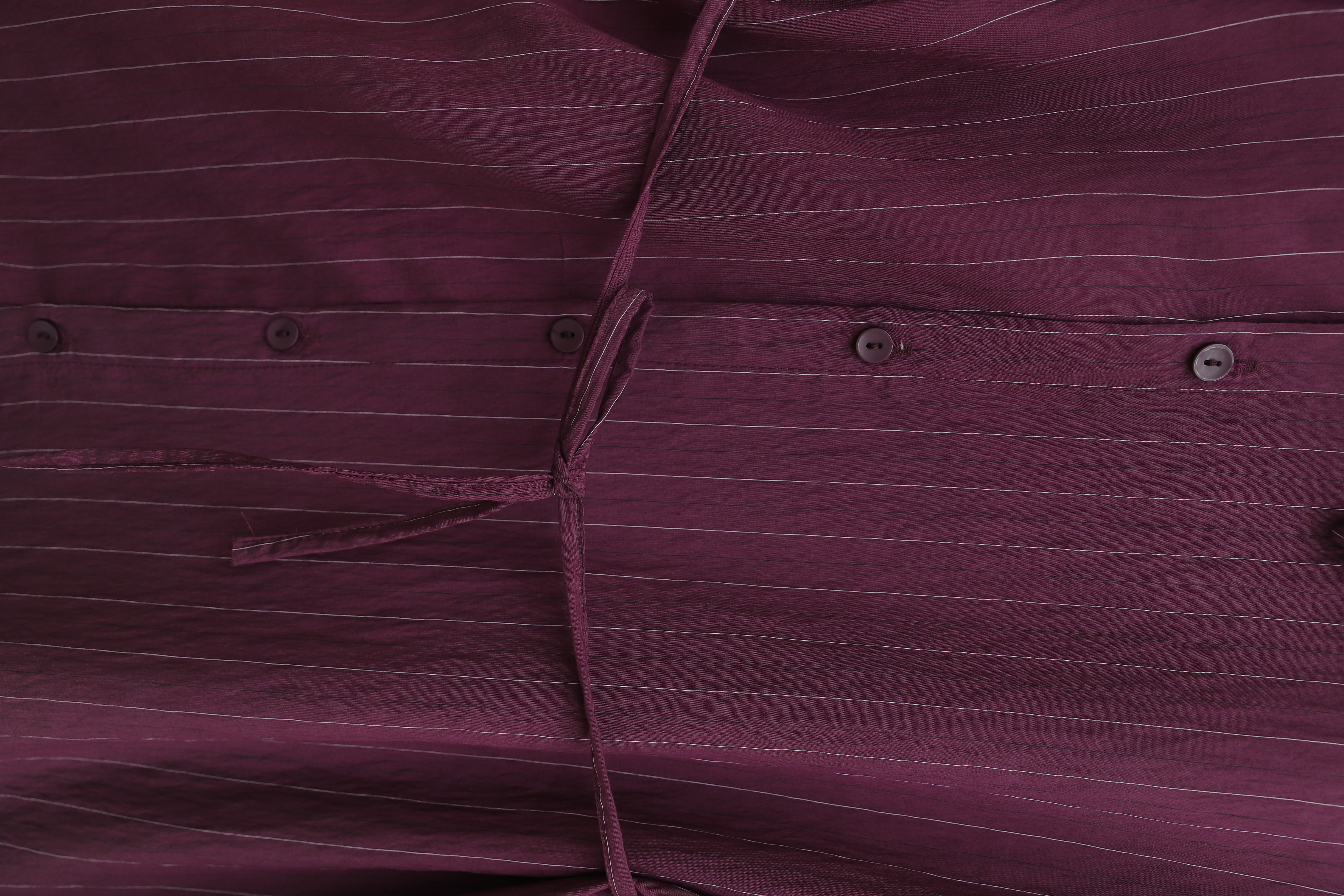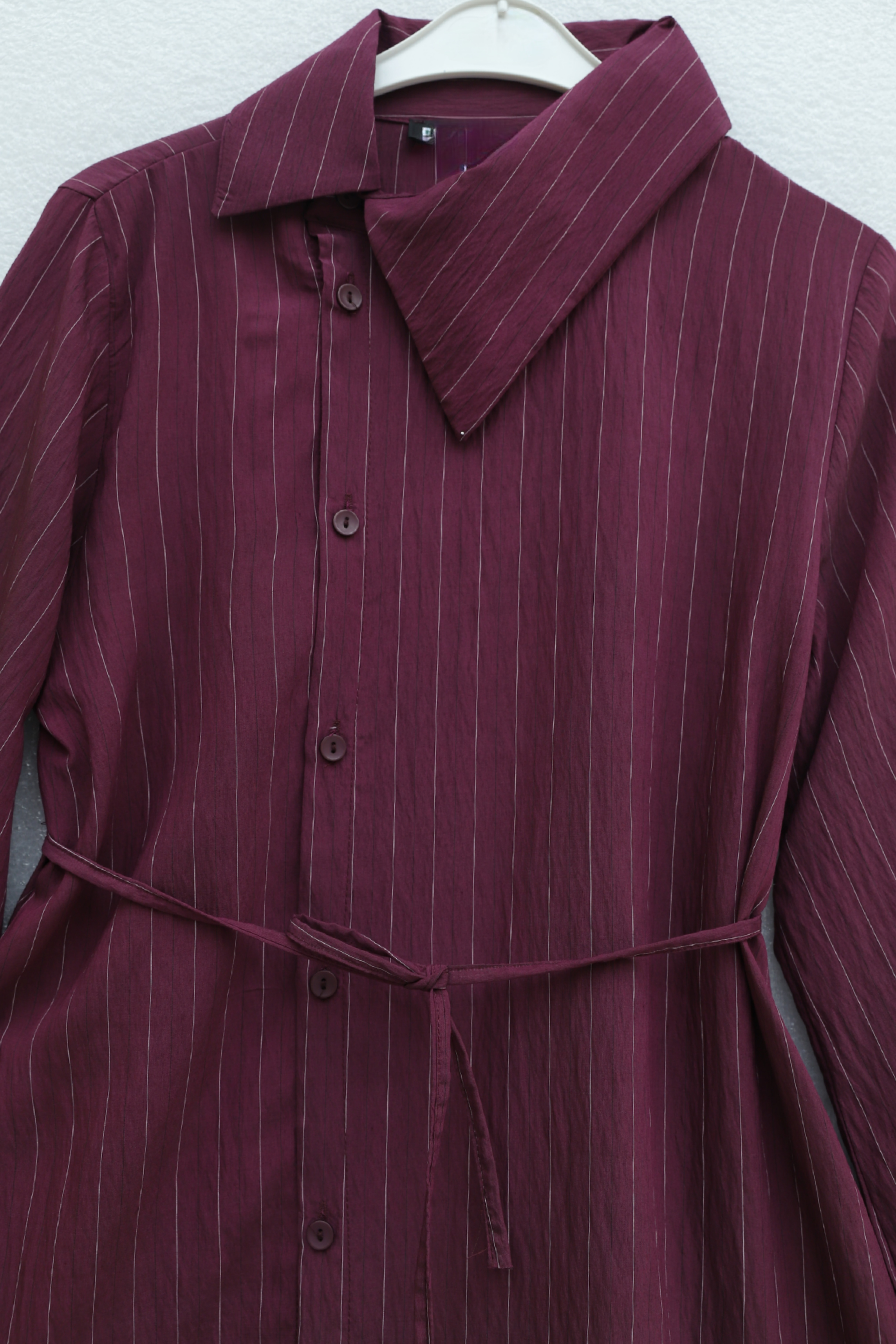 Podyumplus Yandan Yakalı Boydan Düğmeli Çizgili Bağcıklı Krinkıl Gömlek -Mürdüm