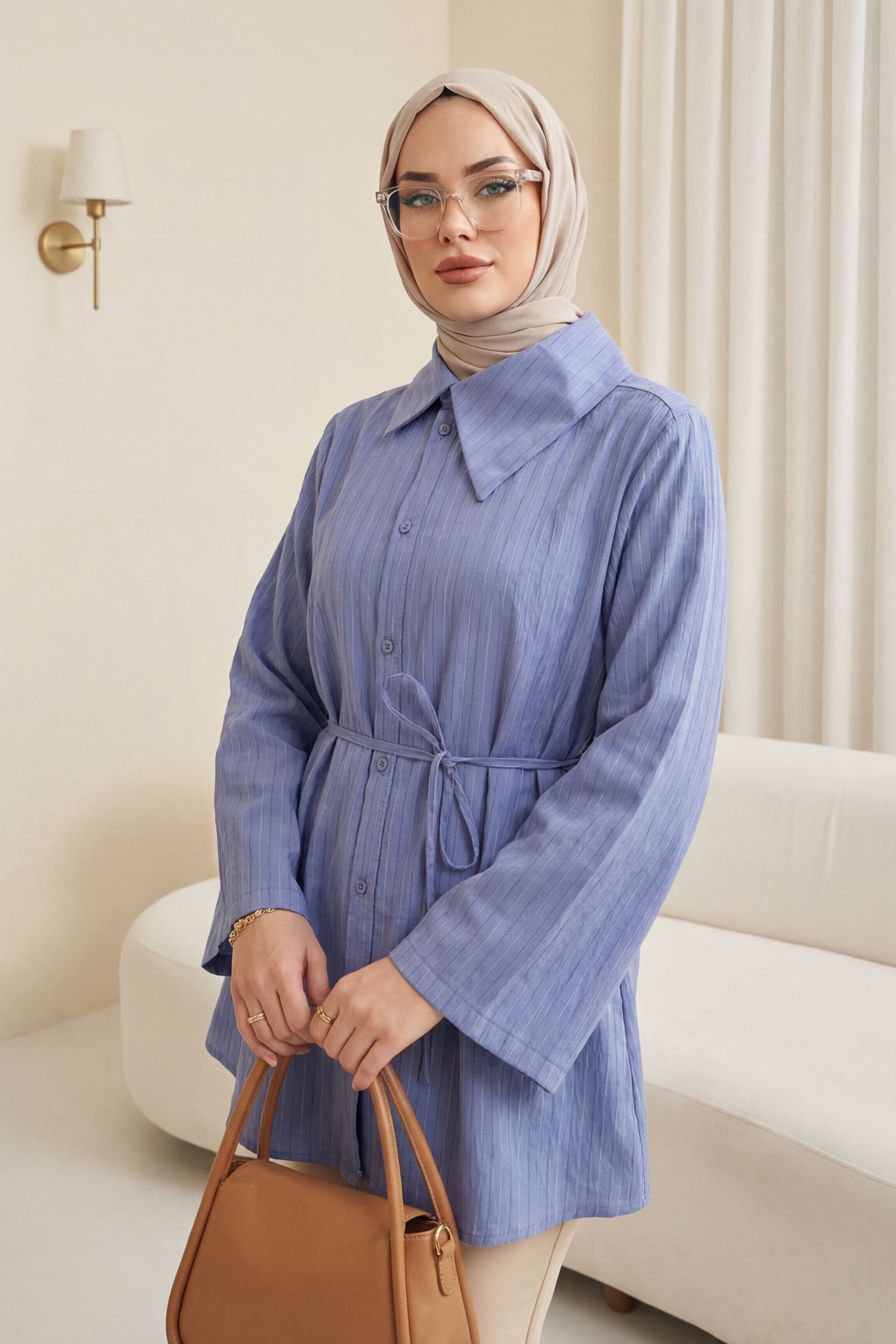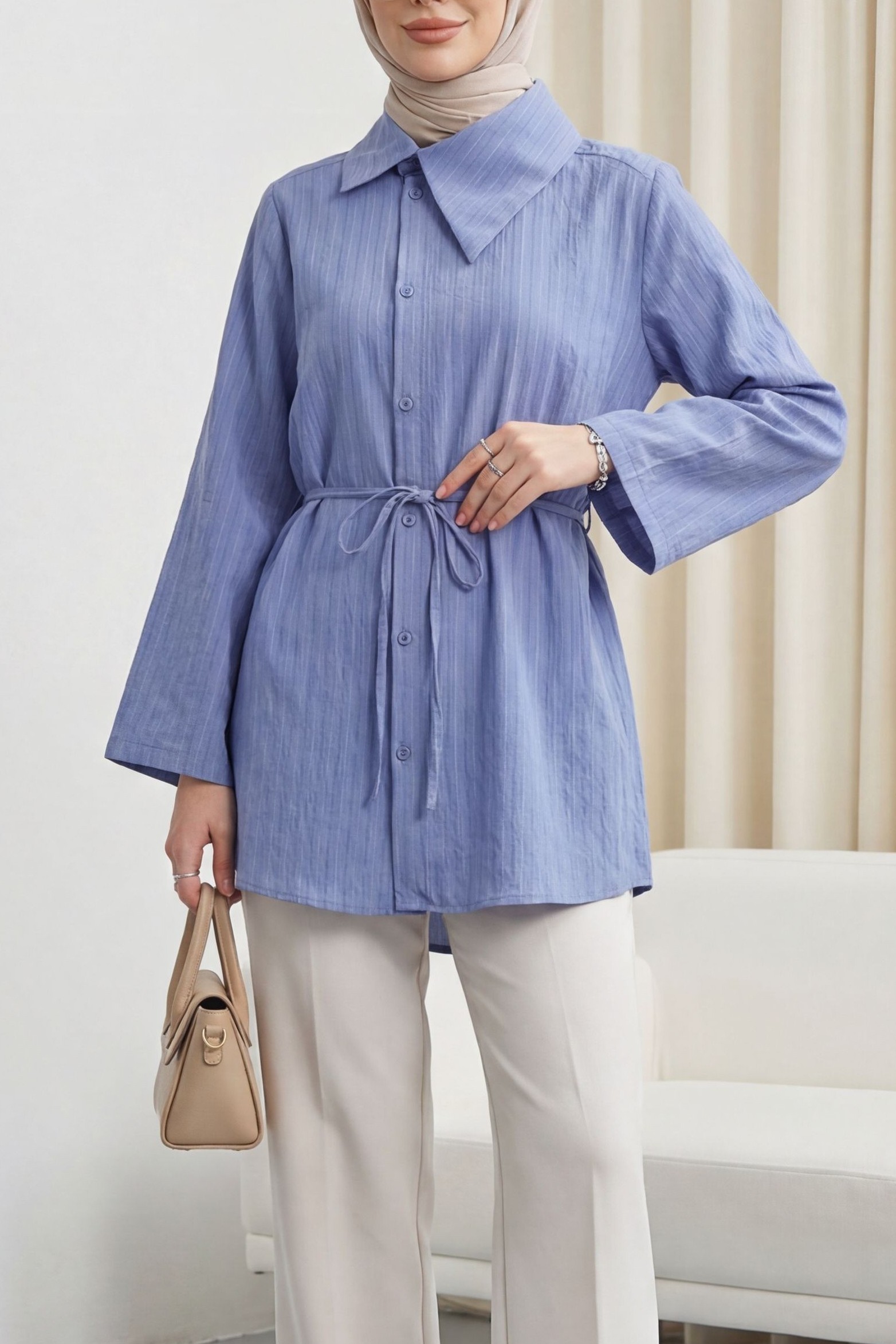 Yandan Yakalı Boydan Düğmeli Çizgili Bağcıklı Krinkıl Gömlek, modern ve dikkat çekici bir stil sunar. Yandan yakalı tasarımı farklı bir görünüm kazandırırken, boydan düğmeli formu klasik bir şıklık sağlar. Çizgili deseni zamansız bir hava katarken, bağcıklı detayı silueti estetik şekilde vurgular. Krinkıl kumaşı hafif ve rahat bir kullanım sunar.