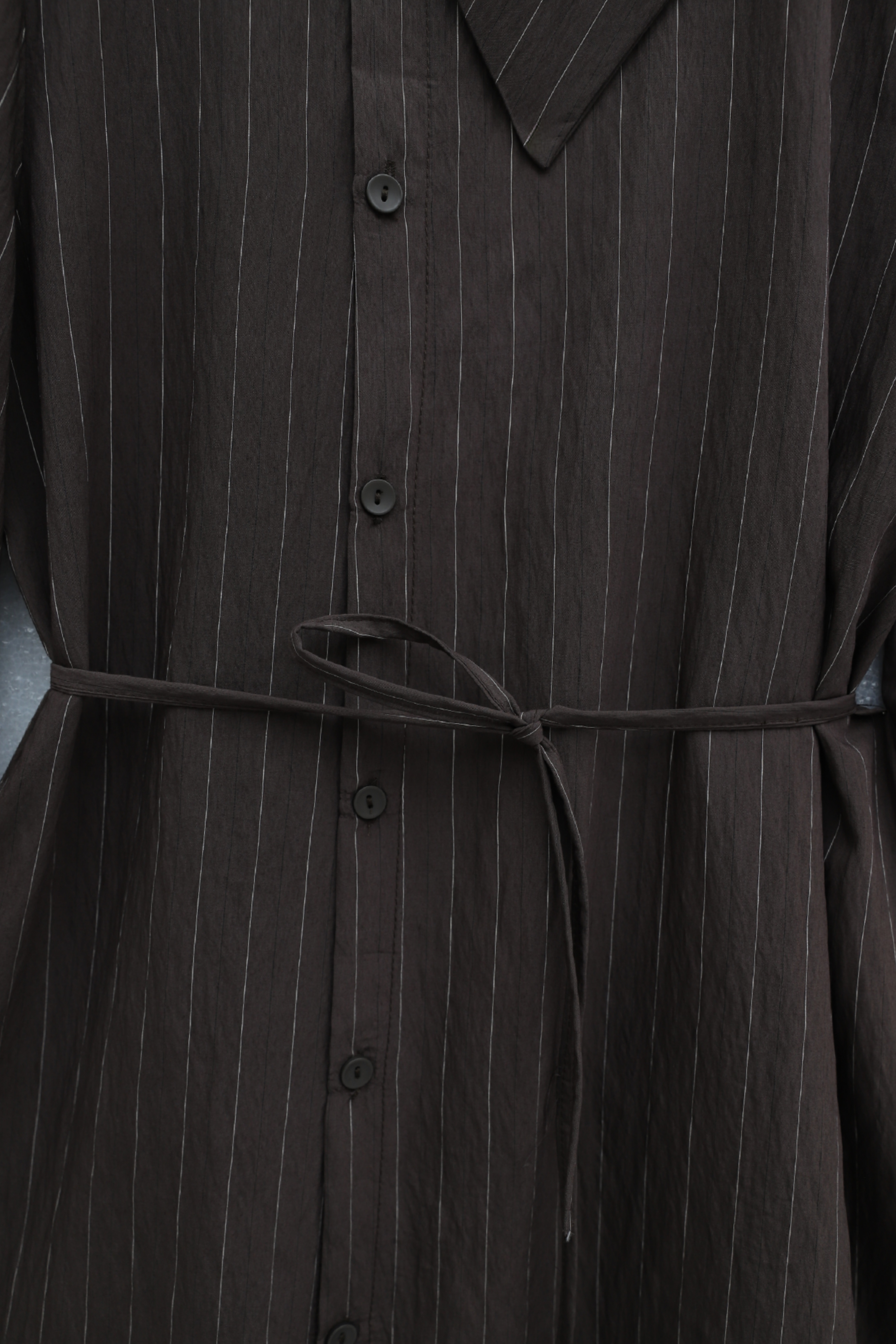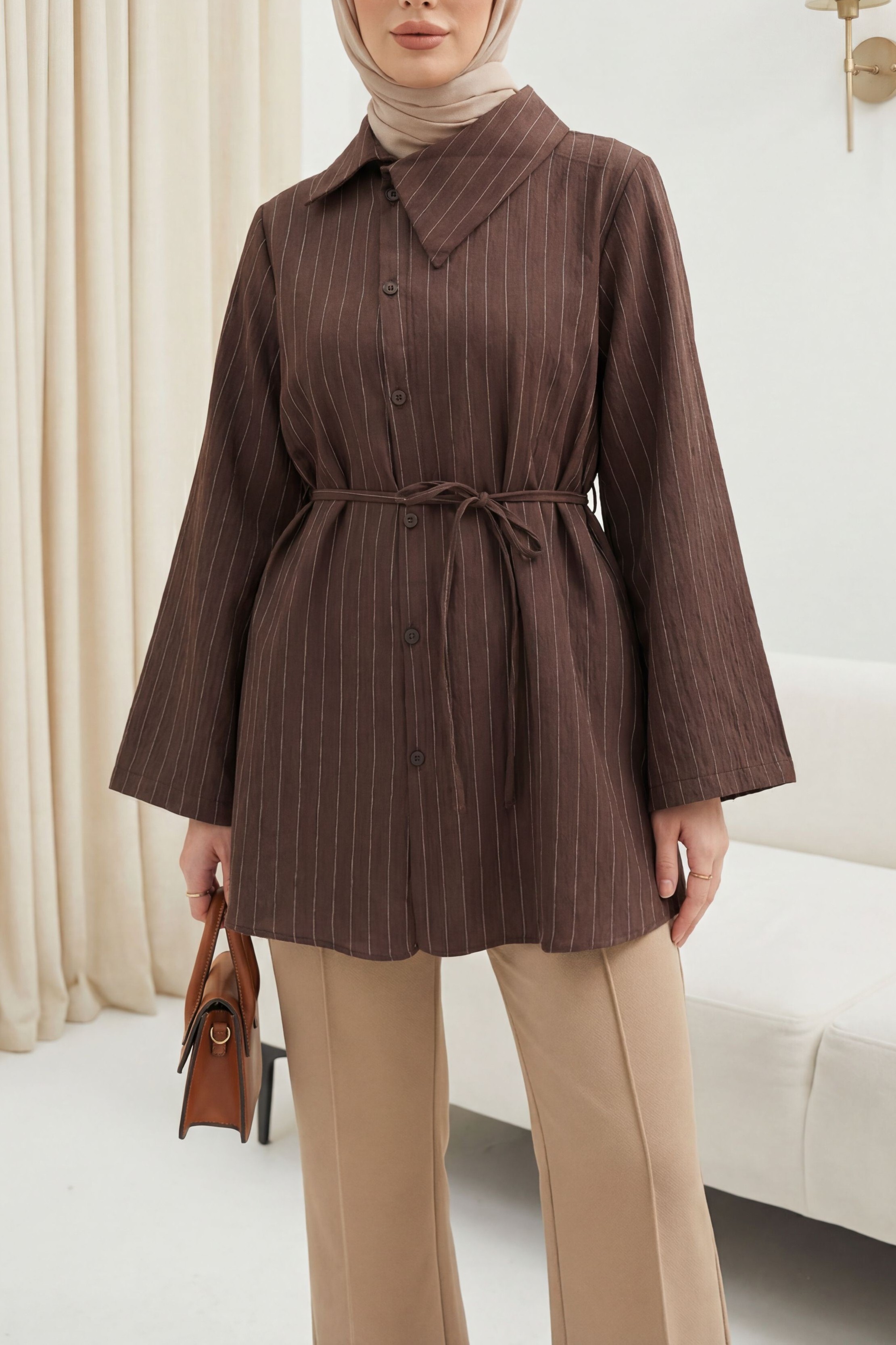 Podyumplus Yandan Yakalı Boydan Düğmeli Çizgili Bağcıklı Krinkıl Gömlek -Kahve