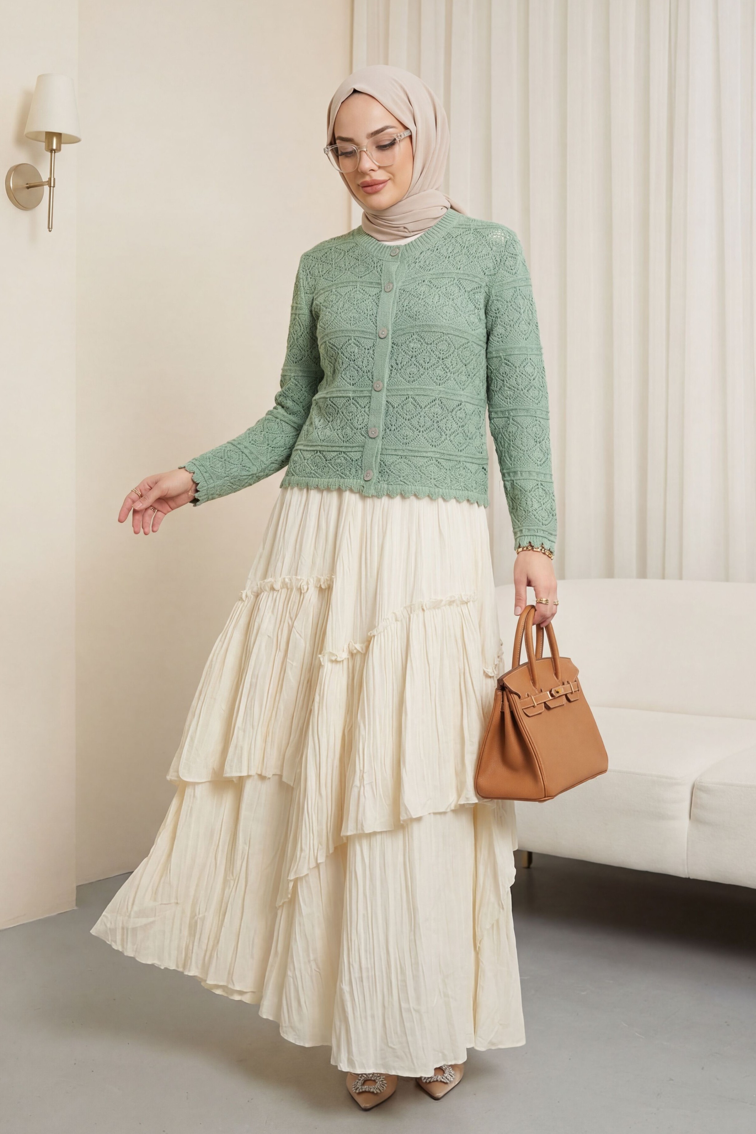 Düğmeli Desenli Ajurlu Triko Hırka, şık ve rahat bir stil sunar. Ajurlu triko dokusu ve desenli yapısı tasarıma hareket katarken, düğmeli formu klasik bir görünüm sağlar. Yumuşak ve konforlu yapısı sayesinde günlük kombinlerde kolayca tercih edilir.