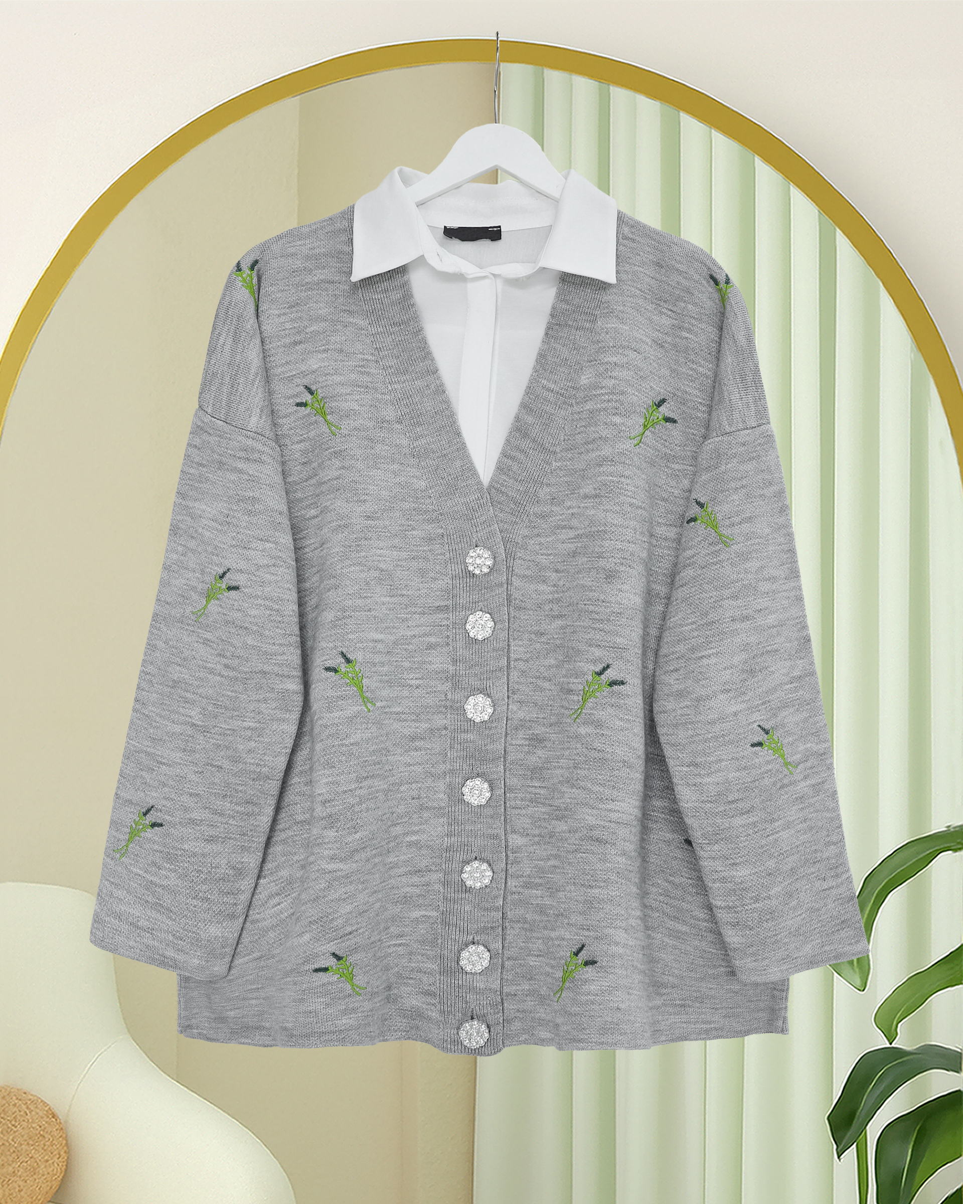 Taşlı Düğmeli Dal Desenli Triko Hırka