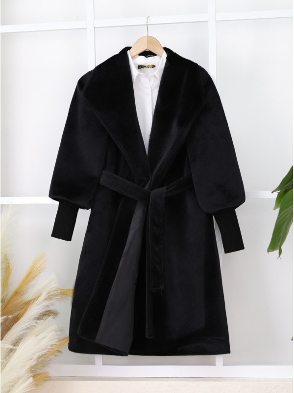 Kadın Kemerli Oversize Kürklü Kaban 9156 - Siyah