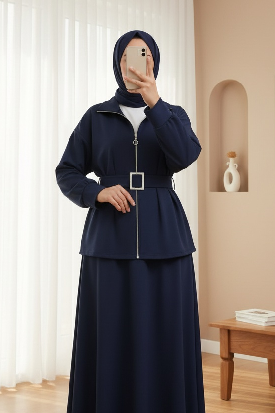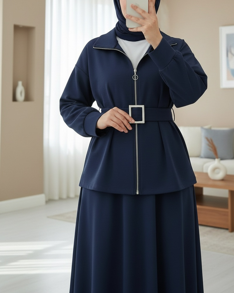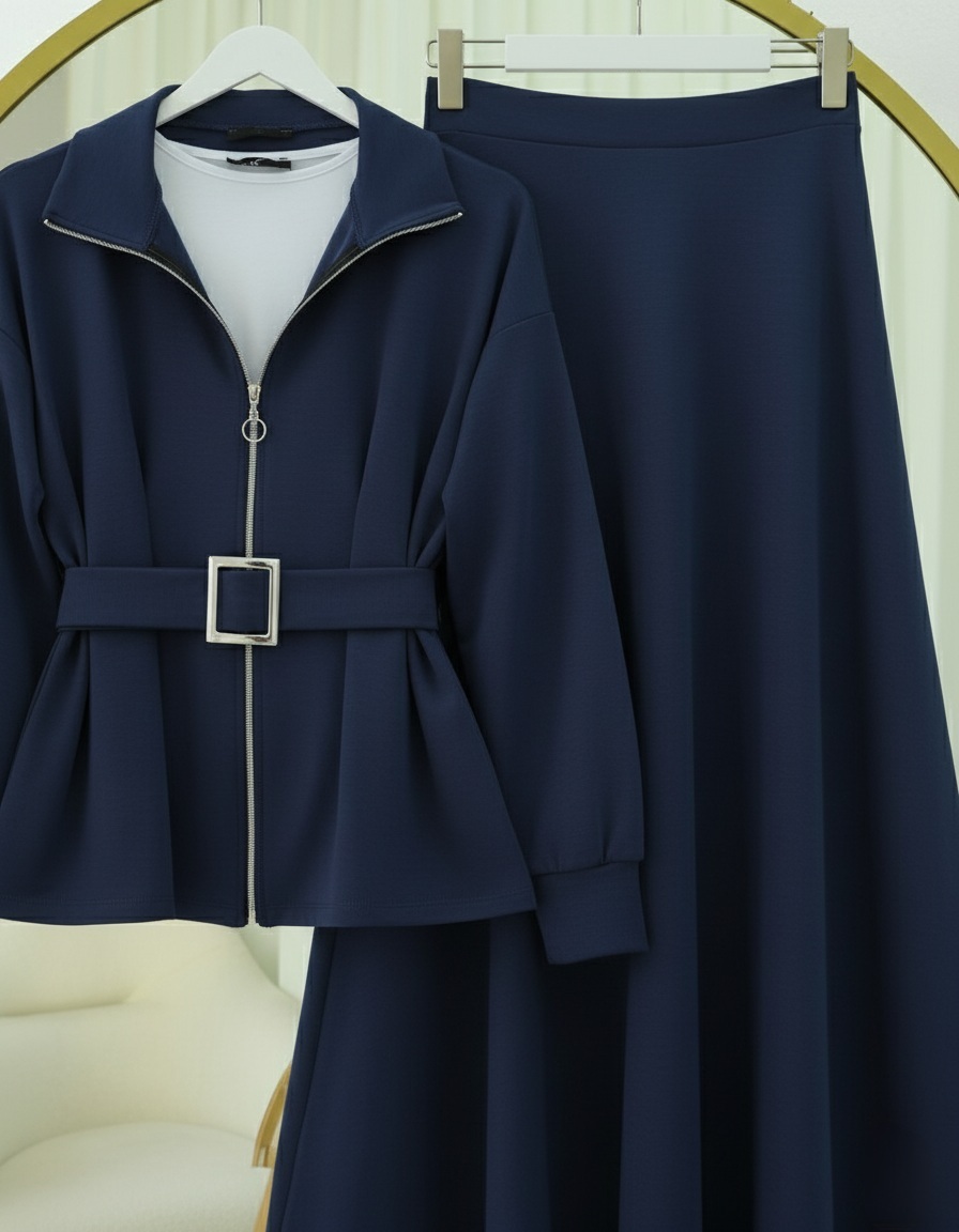 Beli katlamalı, önü fermuarlı ve kemerli tasarımıyla şıklığı rahatlıkla buluşturan bu penye takım, modern ve dinamik bir stil sunuyor. Hem konforlu hem de şık!