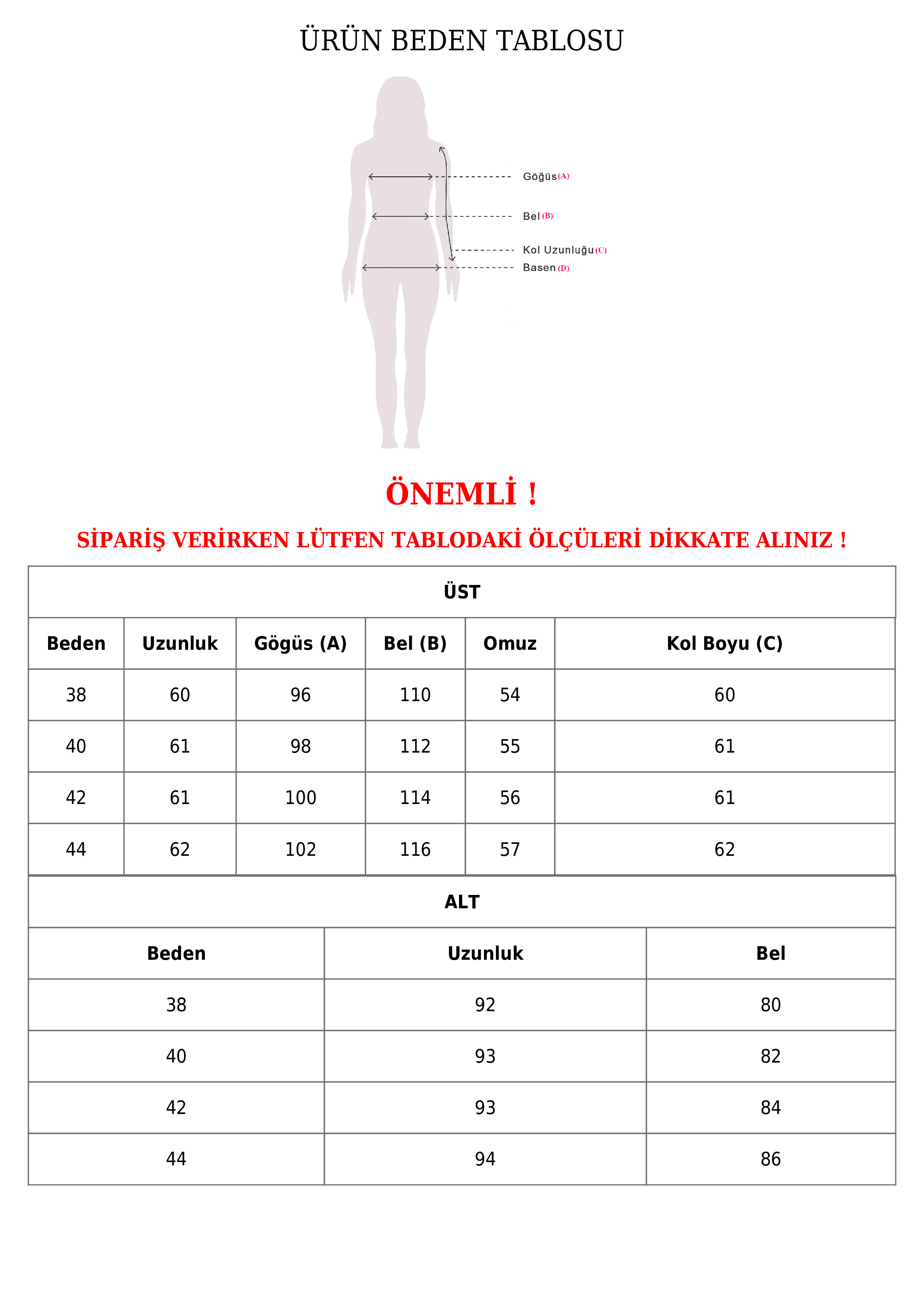 | Beden | Uzunluk | Göğüs | Bel | Omuz | Kol Boyu | |