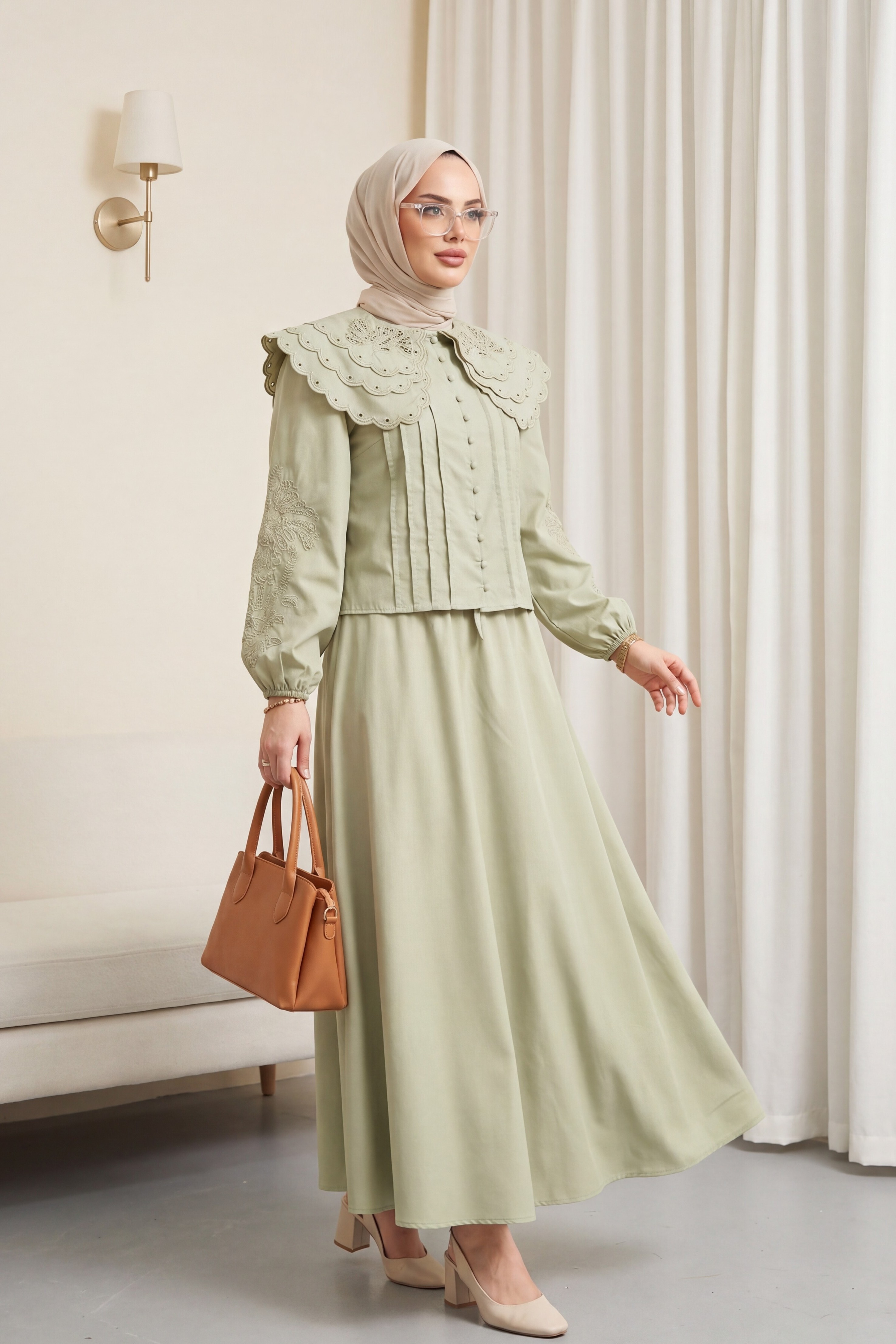 Kombindeki şal, çanta, ayakkabı ve takılar aksesuar olarak kullanılmıştır.
