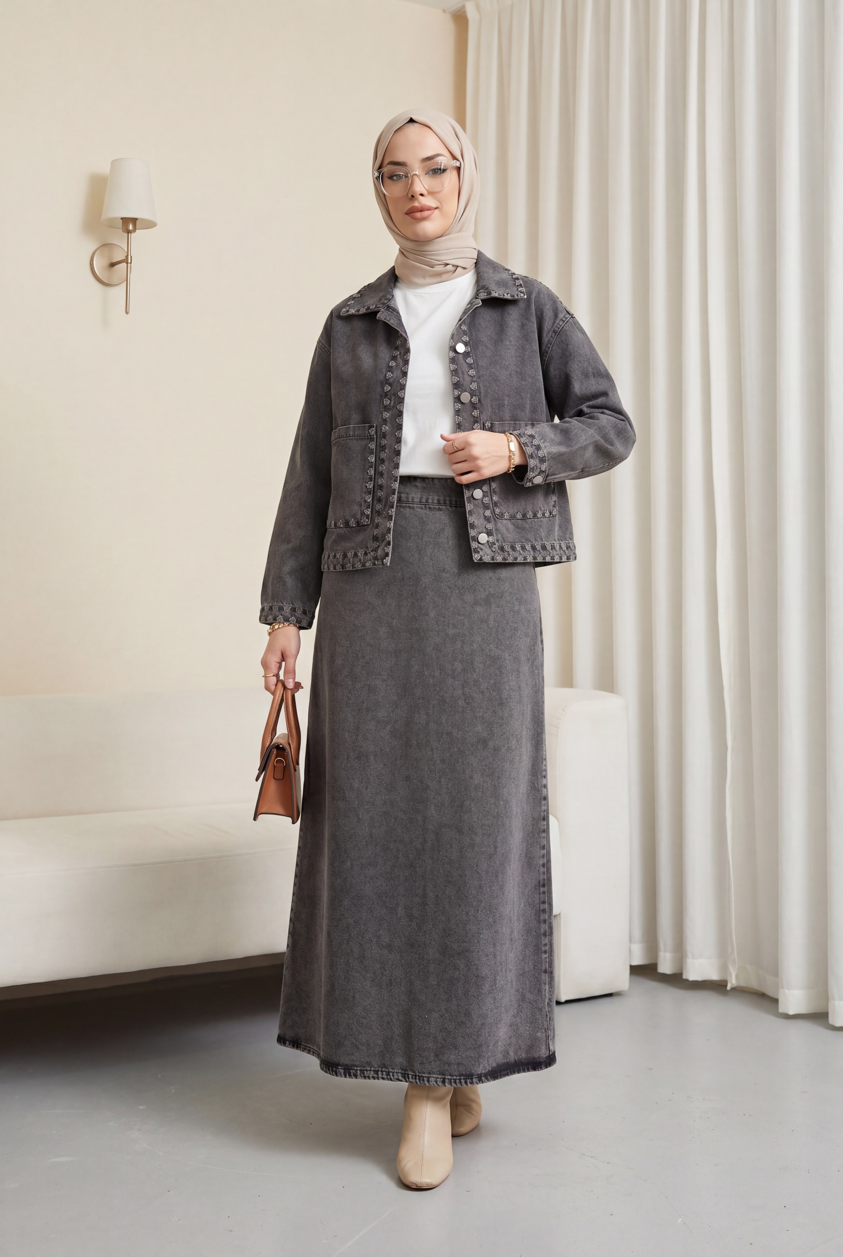 Nakış Detaylı Çift Cepli Önü Düğmeli Etekli Kot Takım, modern ve zarif bir stil sunar. Nakış detayları tasarıma feminen bir dokunuş katarken, çift cepli yapısı pratik kullanım sağlar. Önü düğmeli formu klasik bir görünüm sunar. Etekli tasarımı dengeli ve şık bir siluet oluşturur. Kot kumaşı dayanıklı ve konforludur.