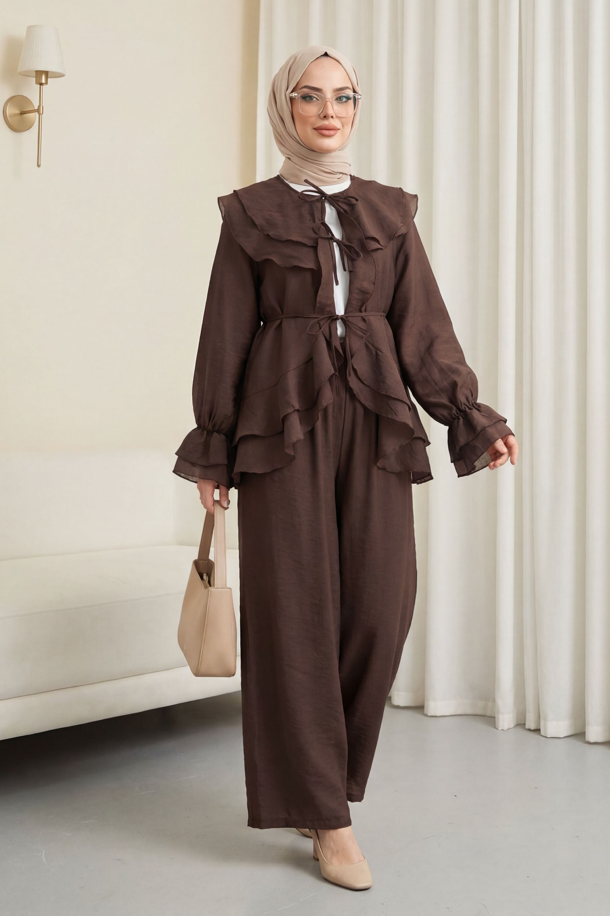 “cupra pantolonlu takım”, “bağcıklı şık takım”, “kat yakalı kadın takım”, “modern ikili takım modeli” gibi adlandırılabilir.