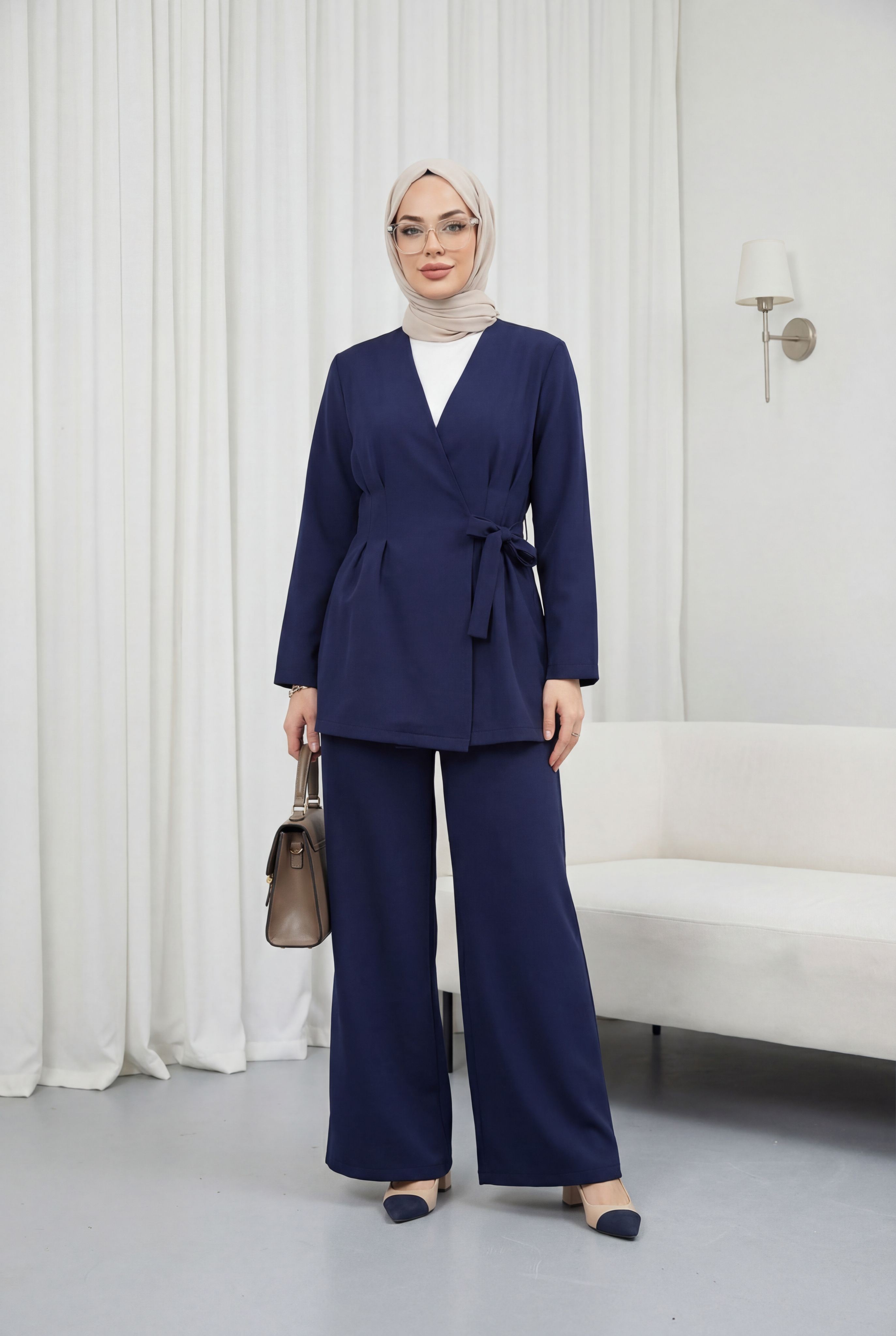 “krep pantolonlu takım”, “çapraz bağlamalı takım”, “şık kadın takım modeli”, “modern ikili takım” gibi adlandırılabilir.