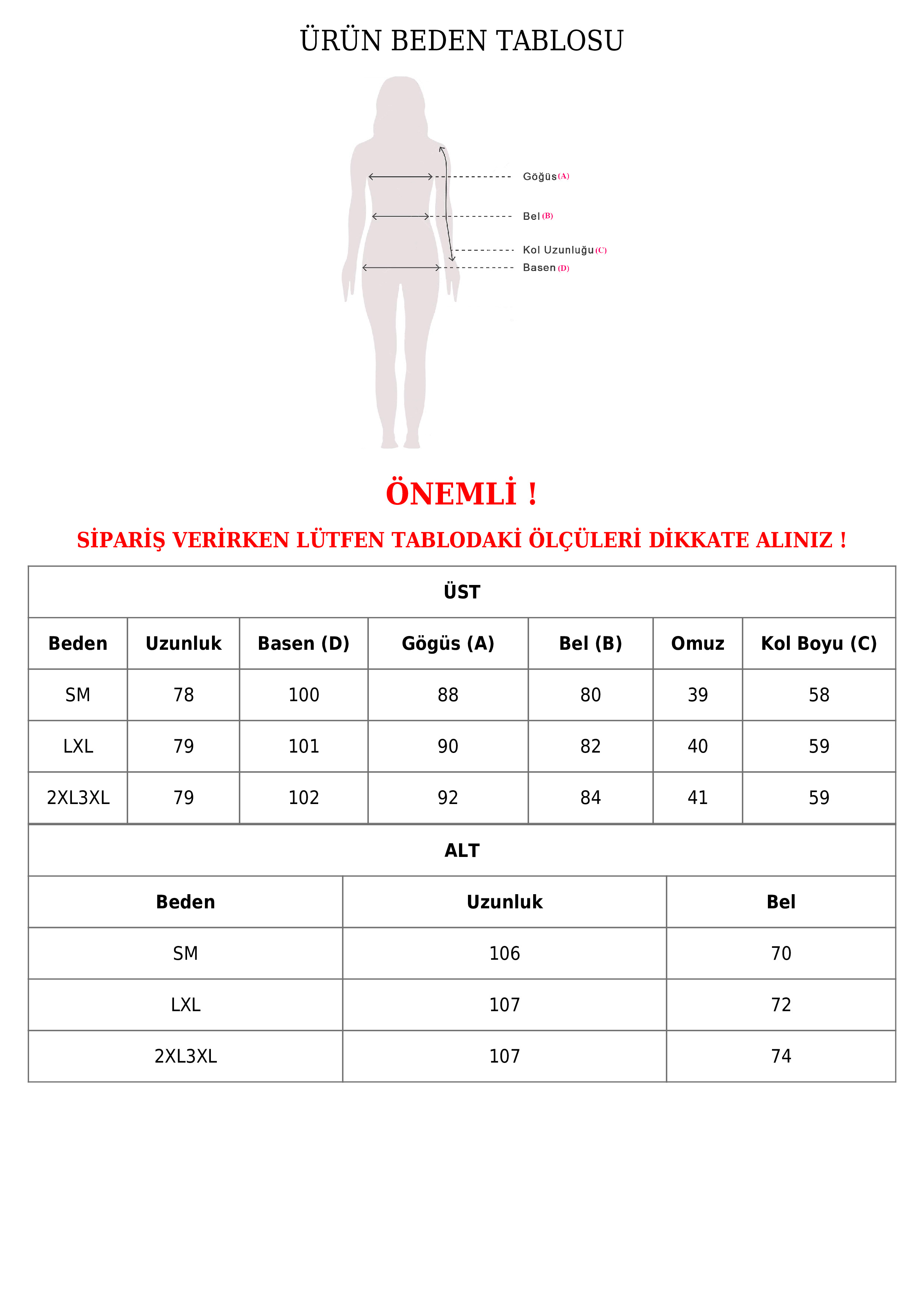 | Beden | Uzunluk | Basen | Göğüs | Bel | Omuz | Kol Boyu |
