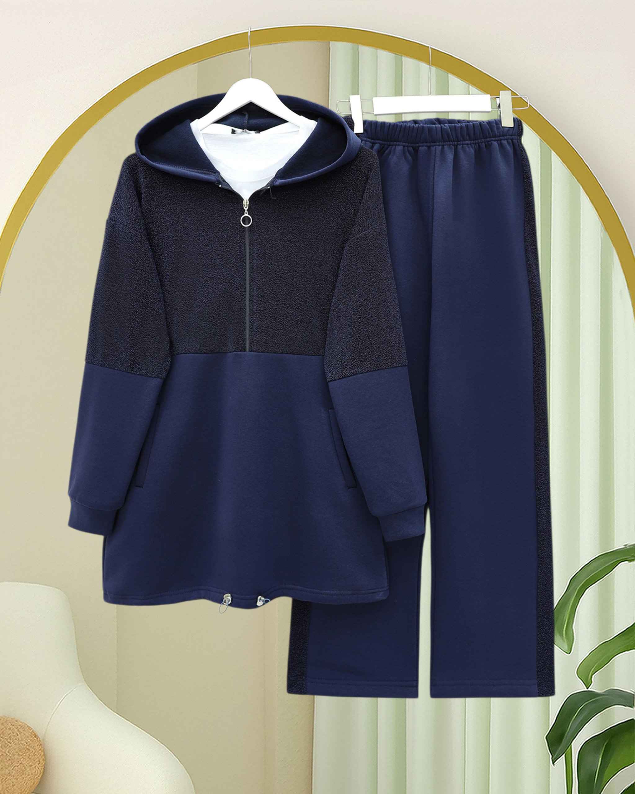 Spor şıklığı modern ışıltılarla buluşturan Yarım Fermuarlı Sim Detaylı Kapşonlu Üç İplik Takım, rahatlığı ve trend görünümü bir arada sunan özel bir tasarımdır. Üç iplik kalın dokuma kumaşı sayesinde sıcak tutarken, simli detaylar modele zarif bir ışıltı kazandırır. Yarım fermuar tasarımı ve kapüşon detayı ise günlük kullanımda hem pratiklik hem de stil sunar.