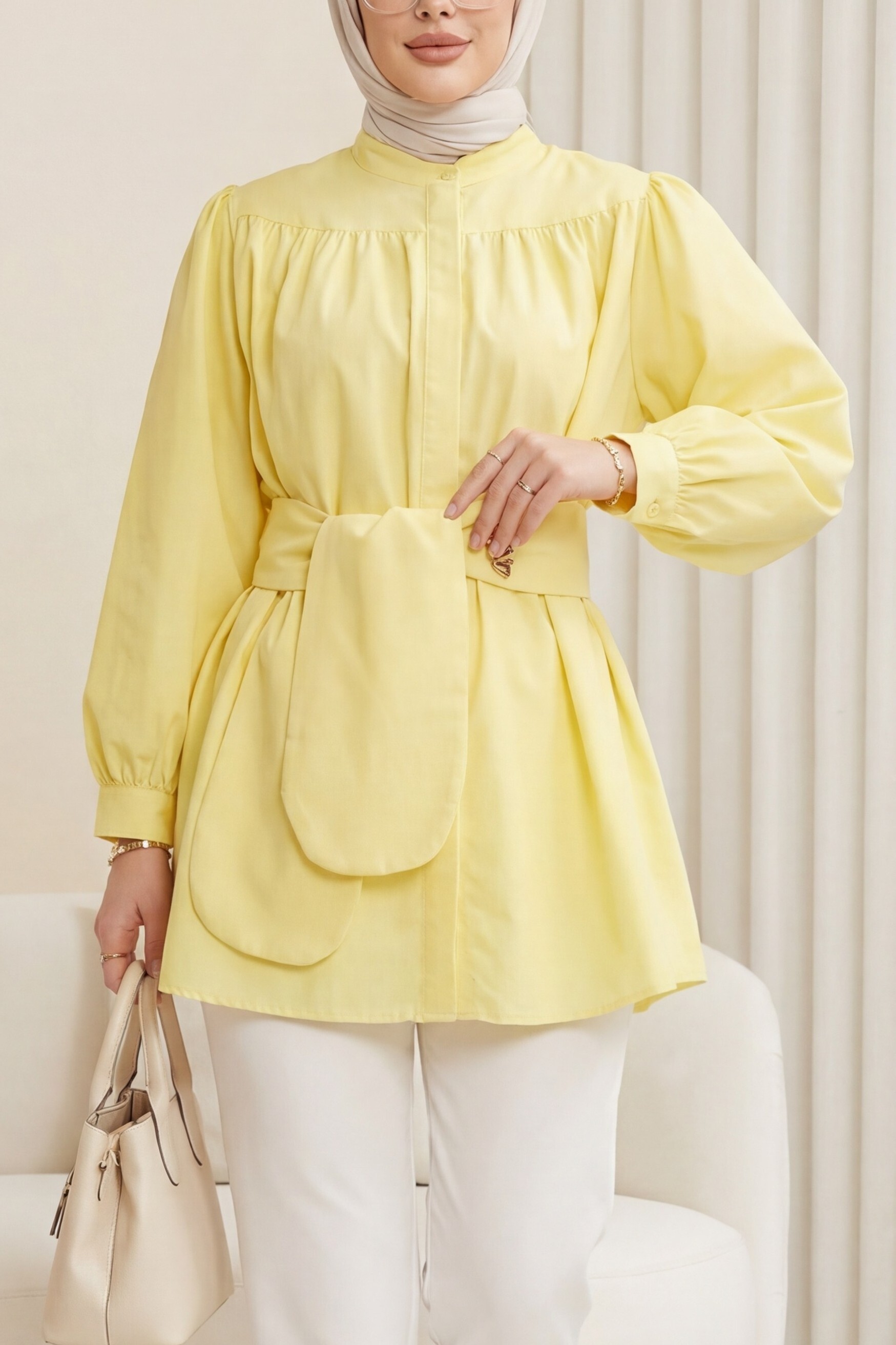 Podyumplus Gizli Düğmeli Kuşaklı Poplin Tunik -Sarı