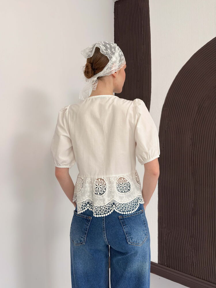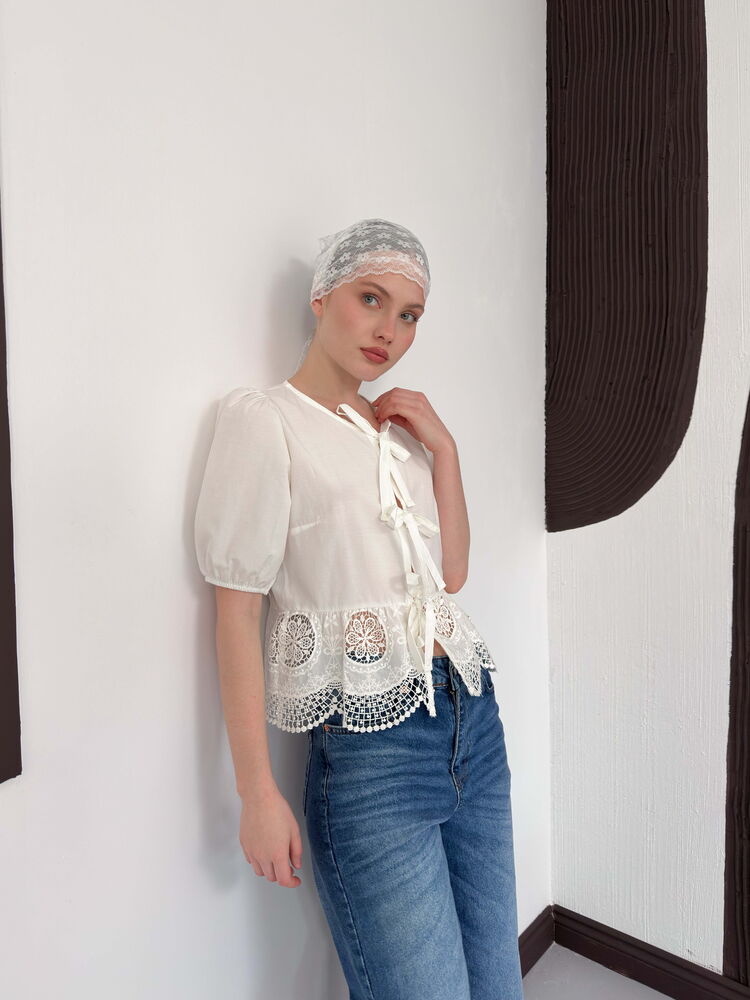 Önden Bağlamalı Brode Bluz - Krem | D2800 Topshow