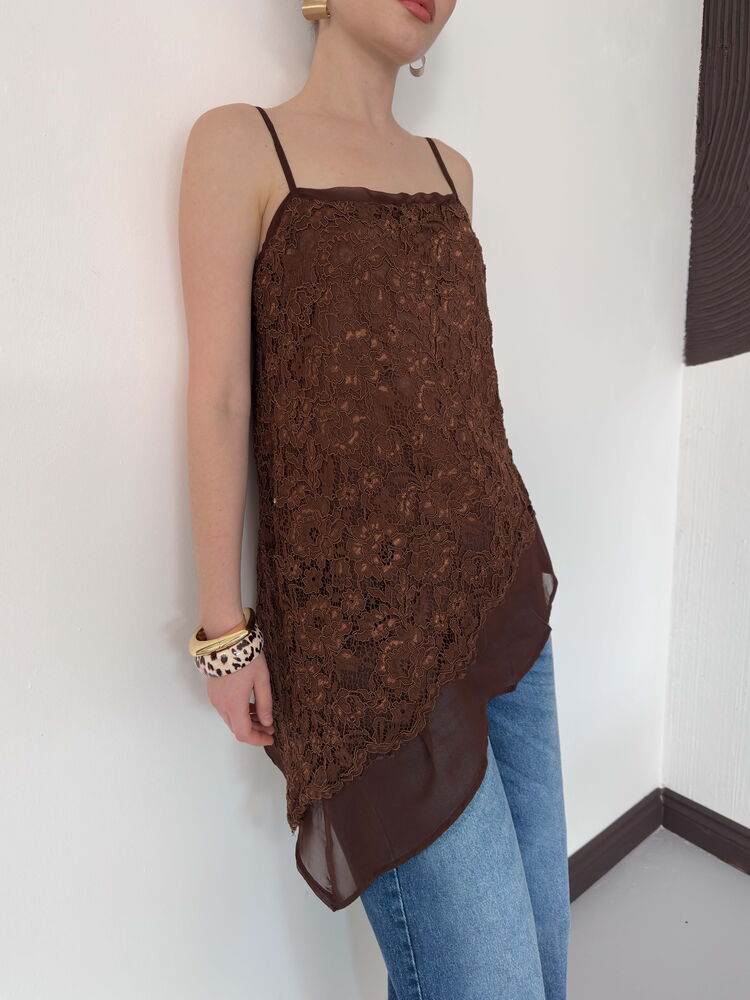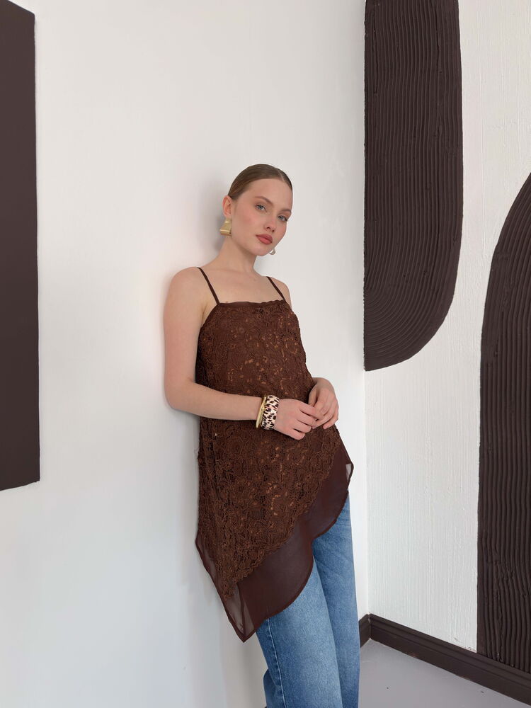 D 2935 ASİMETRİK DANTEL Askılı Bluz - KAHVE