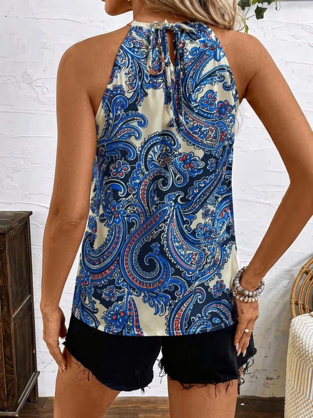 Yakası Bağlamalı Etnik Desen Kolu Lastikli Şifon Bluz -Kahve